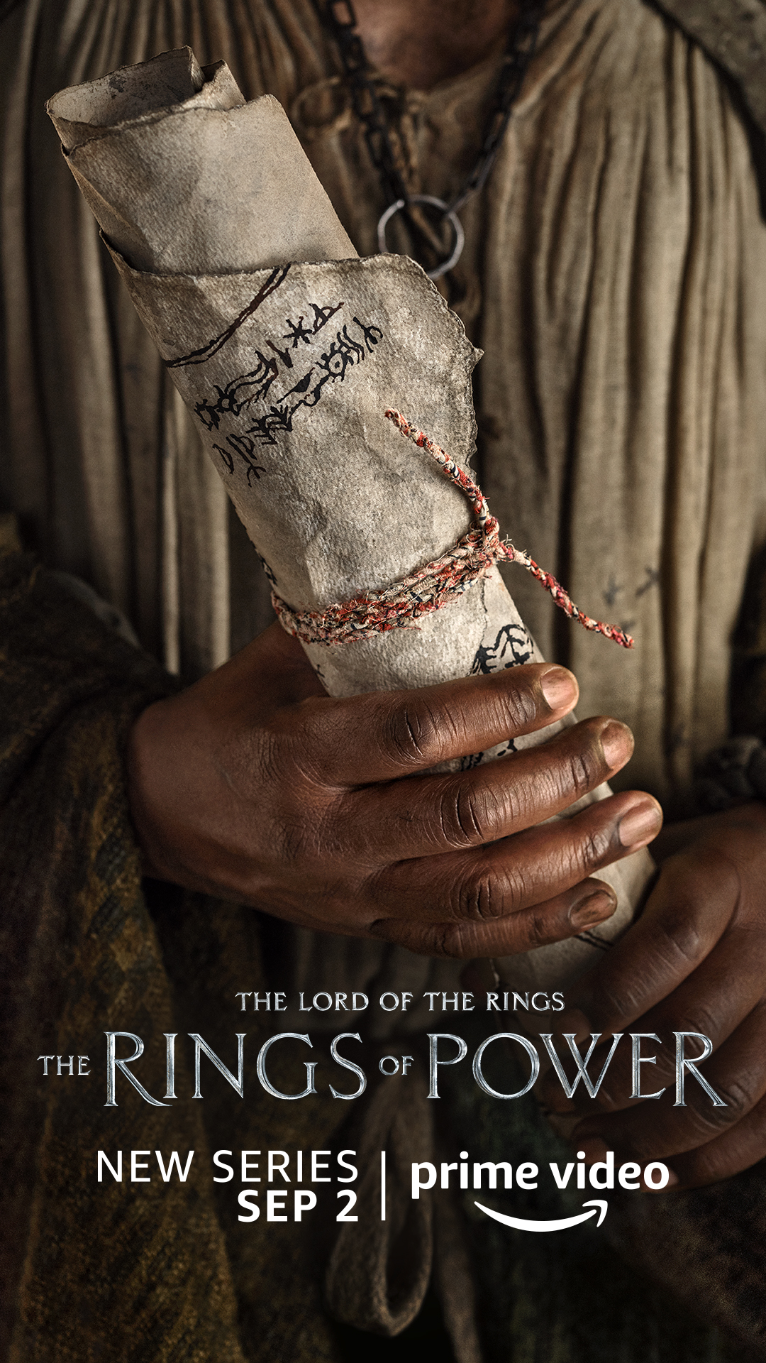 Altra bomba (soprattutto per coloro che fomenteranno i social con questa tematica) sganciata da Amazon Prime Video. Andiamo con ordine prima di urlare al mondo “delle mani nere”. Siamo di fronte ad un uomo che tiene un oggetto molto importante, non è un’arma, ma una pergamena dove si intravedono delle scritte. Le scritte purtroppo non si possono tradurre in quanto non fanno parte di nessun ideogramma inventato da Tolkien quindi qui siamo nella parte inventata dalla produzione della serie Tv (come se mancassero le lingue in questa epopea). Prima considerazione un popolo di un linguaggio sconosciuto della Terra di Mezzo. Tornando al significato delle mani nere, come uno dei primi poster commentati possiamo asserire di avere davanti uno dei popoli dell’Est. La vesta non è di alto rango, ma semplicemente una tunica molto sobria, con un mantello anch’esso non vistoso e una catena tipica dei contadini medievali dove si intravede un anello di chiusura. Se dovessimo andare più a fondo escludendo i Popoli dell’Est iniziamo a riflettere anche sull’origine di Numenor. I Numenoreani erano discendenti degli uomini, di quelle tre famose casate degli uomini che provenivano dall’Est per arrivare nel Belerian e in più esulando dalla trama classica mettiamoci che quando Tolkien pensava alla civiltà dei Numenoreani la paragonò più volte a quella degli Egizi. Quindi non è escluso che ci possa essere anche una parte della popolazione, con cui entrarono in contatto i Numenoreani, che fosse di pelle scura. Un’altra ipotesi è quella di un semplice messaggero con in mano qualche trattato o documento importante da consegnare a qualche personaggio di Numenor, considerando anche che quando Sauron intorno al 500 della Seconda Era ritorna lo fa direttamente dalle Terre dell’Est quindi potrebbe anche portarsi dietro una scorta di personaggi o messaggeri.