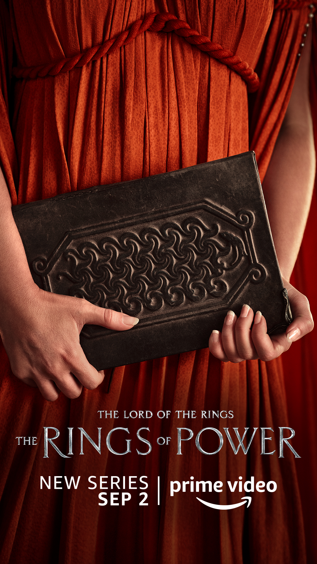 Altro giro altra donna. Donna in tutto e per tutto senza nessun indugio. Dall’abito così curato di color rosso con le corde che esaltano le forme della stessa donna che lo indossa. Nella parte alta delle spalline notiamo dei dettagli in perla che ci fanno intuire che parliamo di una donna di alto lignaggio probabilmente. Il focus come sempre sulle mani e sull’oggetto ci racconta un po’ di storia di questa donna. Abbiamo un libro con una copertina che ci svela probabilmente molto: una simbologia marina con delle onde e un delfino (o un altro pesce) nella sommità. Noi sappiamo, notizie certe, che nella famiglia di Elendil oltre ad Isildur e Anarion gli sceneggiatori della serie Tv hanno voluto inserire una sorella, e questo personaggio potrebbe essere proprio quella che porterà nei regni in esilio il racconto e il libro della caduta di Numenor: Akallabeth. Riflessione personale, se il modo di inserire personaggi nuovi è questo ben vengano assolutamente a questo punto.