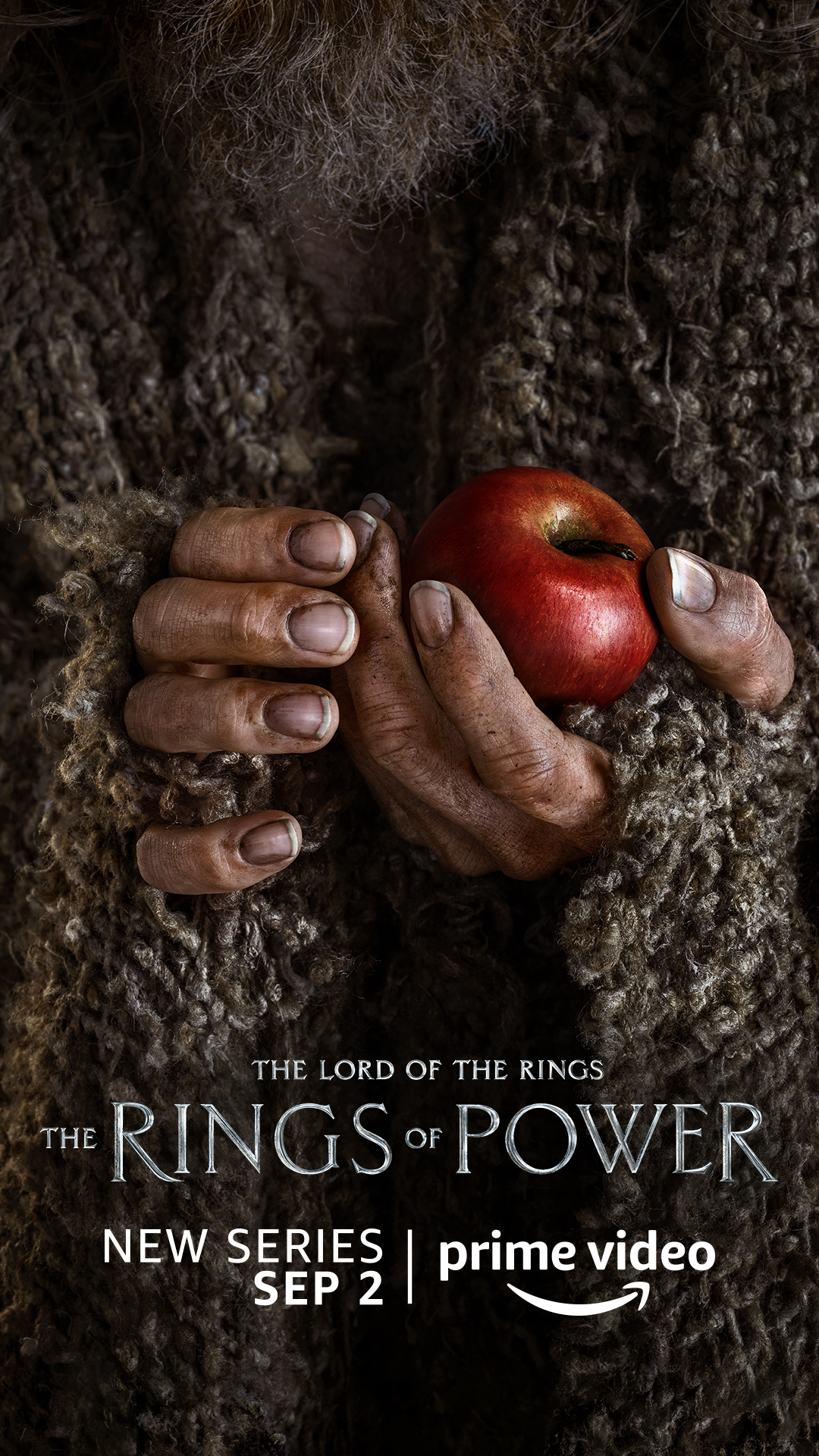 L’arrivo degli stregoni blu con questa seconda immagine è confermata al 100×100 (e ne vedremo delle belle). Abbiamo qua un poster seppur semplice molto forte nel suo contrasto e colore. Il rosse della mela devia ogni cosa tuttavia iniziamo come sempre dalle mani. Delle mani vissute, molto consumate che tengono una mela perfettamente intatta. La maglia tipica dell’iconografia degli stregoni (vedi Gandalf o Radagast) e un principio di barba, non lunghissima, che si intravede a metà petto. Questo poster ci dona una certezza, potremmo vedere in un grande schermo l’arrivo di Annatar e Pallando, forse una delle cose che aspetto di più da questa serie. Tornando all’immagine possiamo aggiungere che le increspature della pelle insieme a queste unghie quasi nere lo rendono un classico viaggiatore della Terra di Mezzo che si arrabatta nella sussistenza giornaliera.