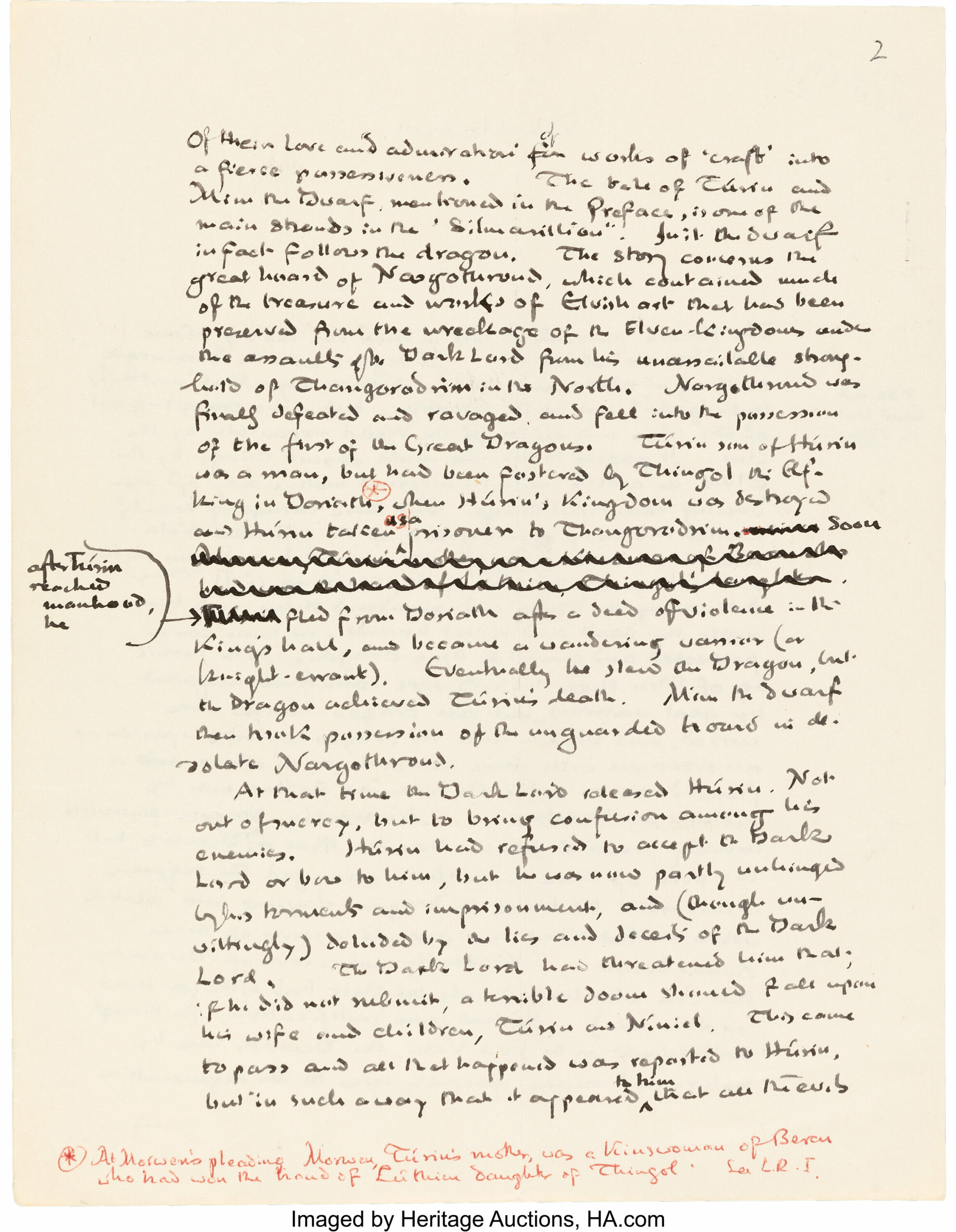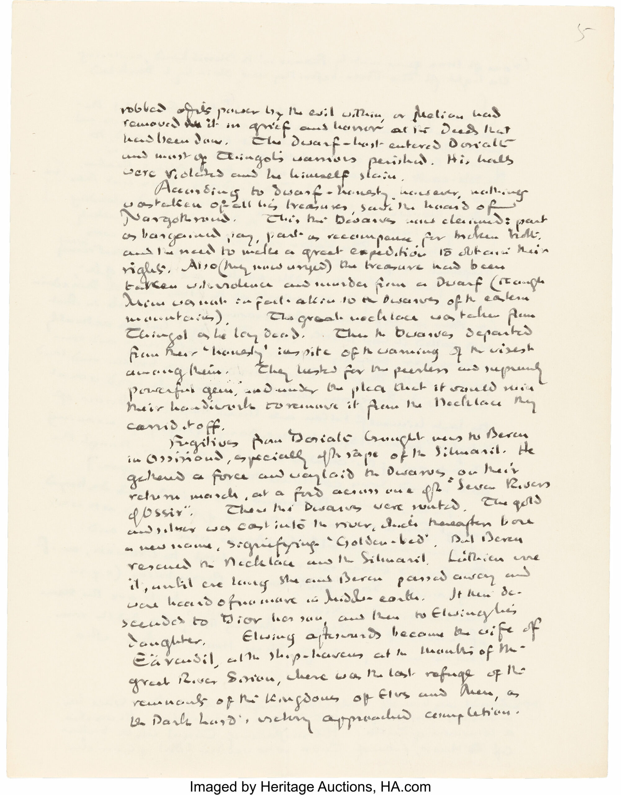 Presumibilmente Tolkien non fece una copia di questo manoscritto, e per il resto non lasciò traccia nelle sue carte per assistere Christopher nel suo lavoro su Il Silmarillion. L’esistenza stessa di questo manoscritto era sconosciuta almeno finché un suo estratto non è apparso in Sotheby’s English Literature and English History, il 6-7 dicembre 1984. Le uniche informazioni disponibili erano quelle disponibili sul catalogo e riprodotte su Beyond Bree nel maggio 1985 : il manoscritto era stato venduto per circa duemila sterline a un non meglio identificato “Chris J Sawyer”, presumibilmente un libraio. Scrivendo del manoscritto, Wayne G. Hammond e Christina Scull avevano commentato che quest’ultima esaminò il manoscritto in uno dei giorni di visione prima dell’asta da Sotheby’s, e scoprì che «fornisce qualche indicazione dei pensieri attuali di Tolkien su alcune parti del Silmarillion». Aveva appena letto The Book of Lost Tales, Part Two (pubblicato il 16 agosto 1984) e l’aveva recensito per Beyond Bree, quindi quel testo le era ben presente; e in relazione a esso, aveva notato gli sviluppi di Tolkien dai Racconti Perduti così come le differenze dal Silmarillion pubblicato. Per quanto riguarda la rovina del Doriath, la storia raccontata nel manoscritto del 1964 è in realtà più vicina alla Quenta Noldorinwa (non pubblicata fino al 1986) che a quella The Nauglafring in The Book of Lost Tales, ma differisce per alcuni aspetti da qualsiasi versione pubblicata: ad esempio, prima di iniziare a lavorare sul tesoro, i Nani accettano il pagamento di un decimo dei metalli grezzi. Thingol, tuttavia, è ancora ucciso fuori Menegroth, con Tolkien che fornisce due possibili ragioni per cui i Nani sono stati in grado di passare la Cintura di Melian.