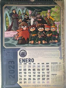 – lo Smial Montaraz: il calendario 2023 di questo Smial della Società Tolkieniana Spagnola (STE) ed è destinato ad accogliere membri della Societià Spagnola che non appartengono a nessuno Smial locale. Il calendario nasce da una proficua e duratura collaborazione tra il fumettista Gonzalo Díez, meglio conosciuto nel mondo come Chapu, e lo studio grafico Barbarroc di Sant Joan De Les Abadesses, in Catalogna. Il calendario è esaurito già dall’inizio di dicembre, ma viene qui menzionato per la sua originalità e il suo stile, molto alternativo e fumettistico. In assenza di immagini della copertina dell’ultimo calendario, ecco l’unica immagine presentata, quella di gennaio 2023, illustrata da Gonzalo Chapu e Sergi Vidal. Qui la pagina facebook dello Smial Montaraz.