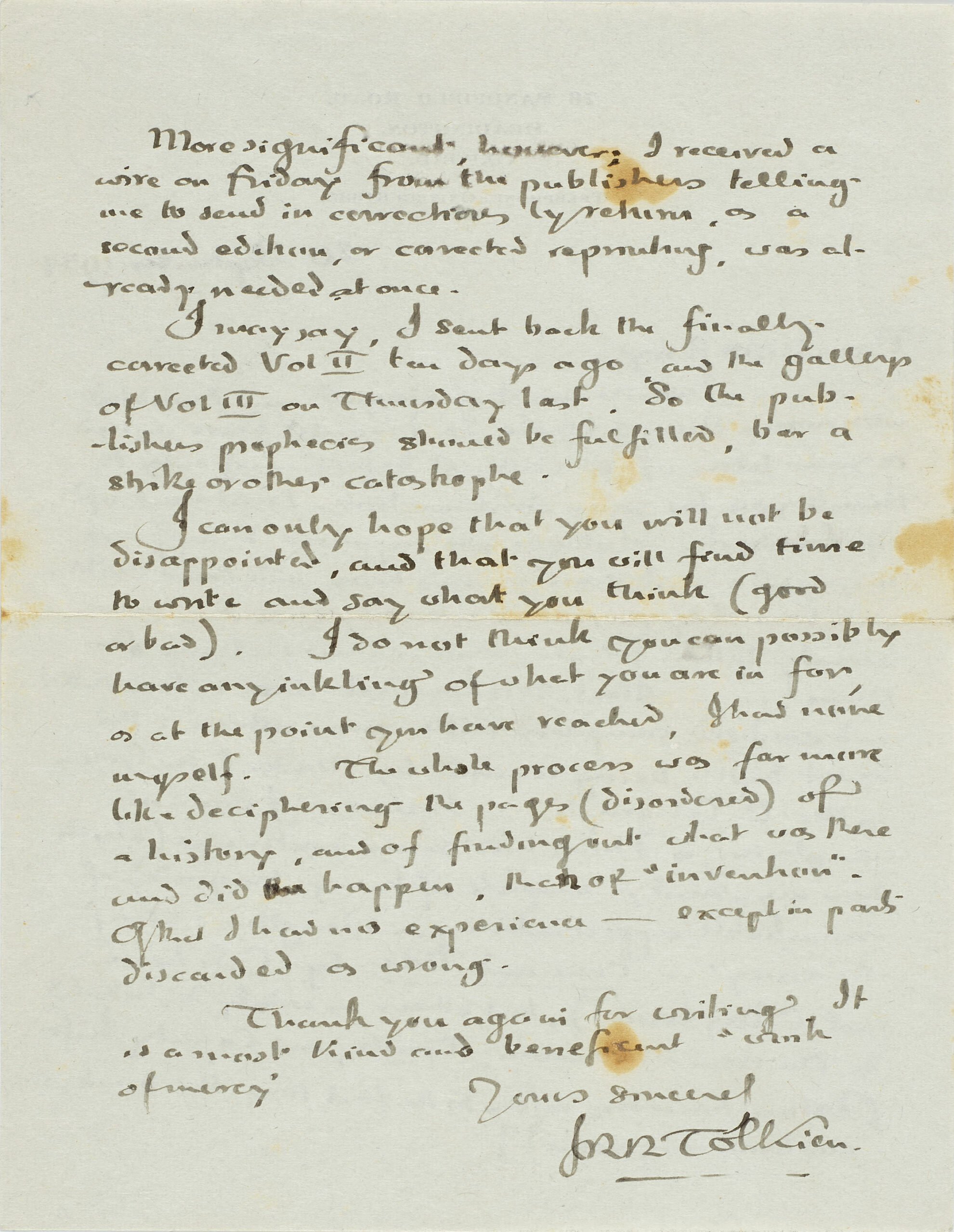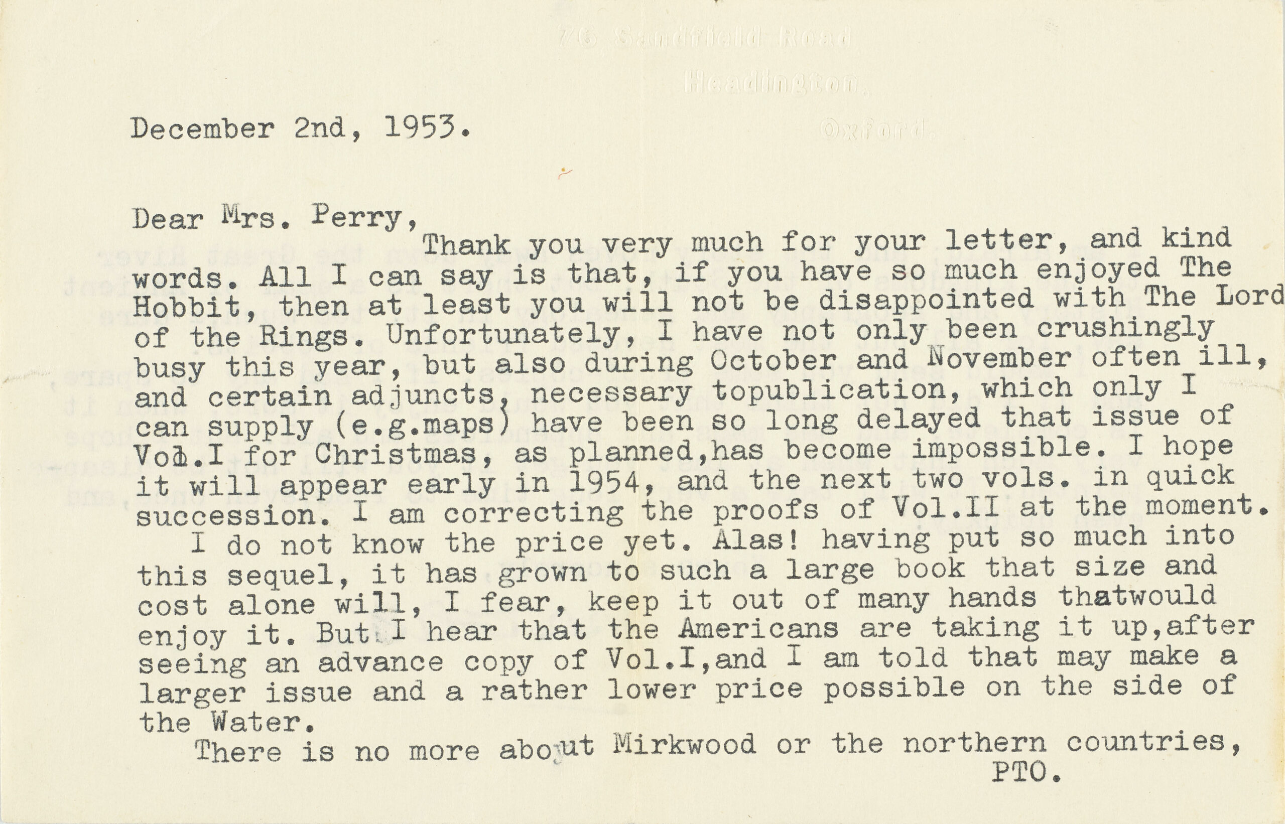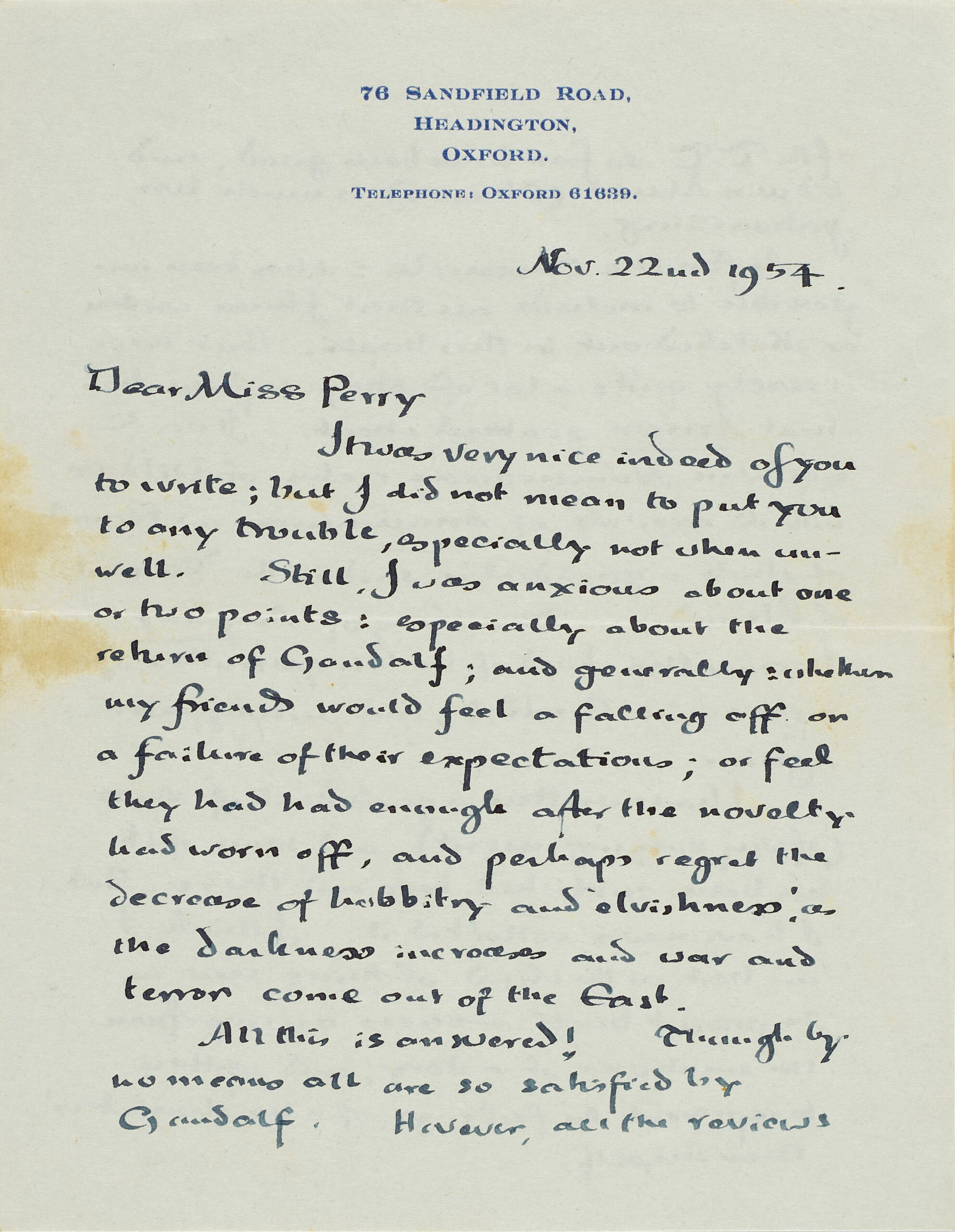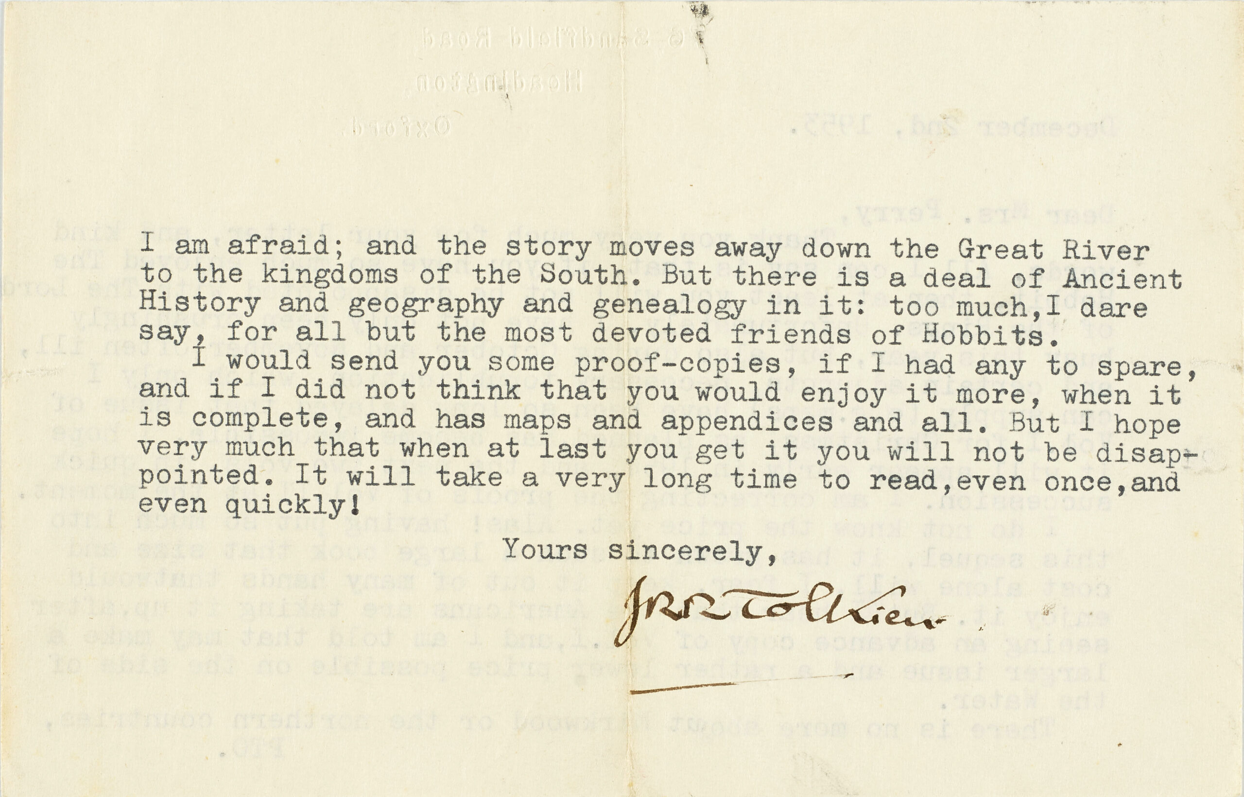 Le lettere autografe di Tolkien fanno spesso capolino in aste prestigiose, tanto che ogni anno abbiamo notizia di qualche supposto inedito che viene proposto per l’acquisto ai collezionisti. Il record è detenuto da una missiva del 3 agosto 1943, in cui Tolkien spiega lo sviluppo delle lingue e delle rune utilizzate nello Hobbit, il suo romanzo d’esordio, venduta da Christie’s a New York il 6 ottobre 2022 per 107.100 dollari. Definita la “Stele di Rosetta della Terra di Mezzo”, questa lettera non era però inedita, visto che era già stata acquistata il 4 maggio 1995 a un’asta di Sotheby’s. Non è raro che il mondo tolkieniano si infiammi di fronte a notizie del genere, anche se spesso molti documenti sono già conosciuti dagli studiosi o dagli appassionati più vigili. In particolare, Hammond e Scull includono già nella loro Chronology qualche lettera di Tolkien indirizzata alla signora Perry: due lettere del 6 e dell’8 agosto 1954, in cui Tolkien replica alla prima recensione entusiastica mai inviatagli della La Compagnia dell’Anello da parte di un lettore o lettrice; una lettera del 28 settembre 1955, dalla quale traspare che Tolkien avesse inviato alla signora Perry una versione di prova del Ritorno del Re; e una lettera del 29 dicembre 1961 in cui Tolkien si scusa per non avere risposto ad alcune missive a causa della confusione che regna tra le sue carte e della ormai debole memoria, che non gli permette di ricordare gli indirizzi. Le lettere incluse nell’asta di Bonhams’ non sono citate dai due studiosi e aggiungono dettagli interessanti sul rapporto epistolare che intercorse per molti anni tra Tolkien e Miss Perry. Esse contengono anche passaggi notevoli che possono arricchire l’immagine di Tolkien scrittore e uomo, nonché il processo compositivo che lo ha condotto alla pubblicazione del Signore degli Anelli.