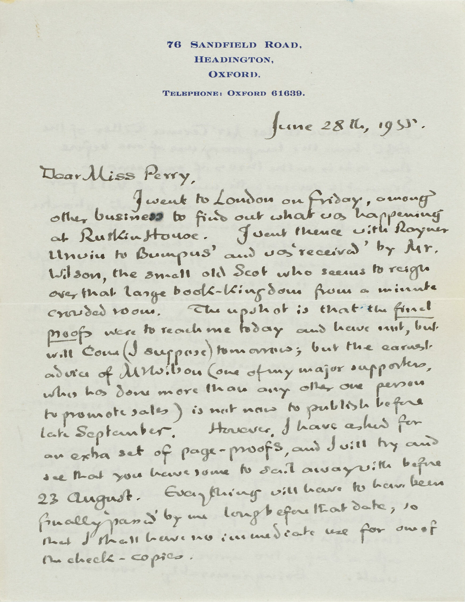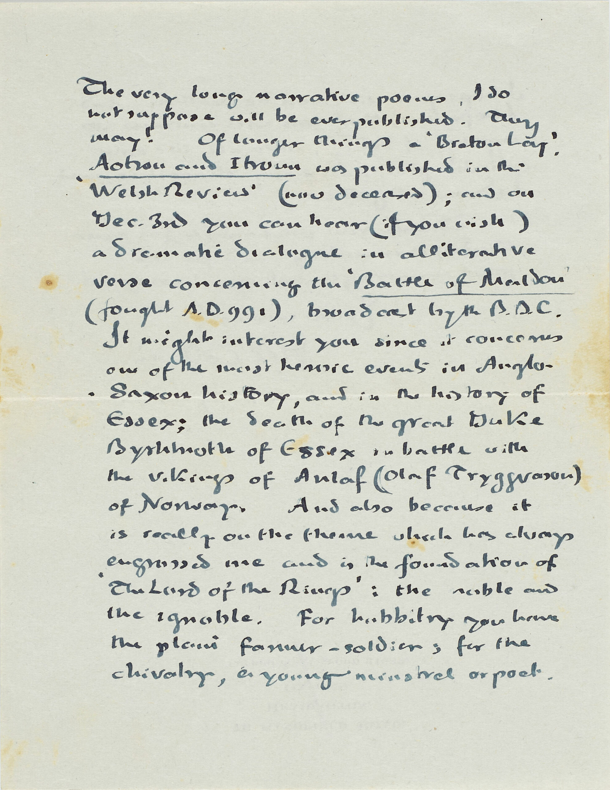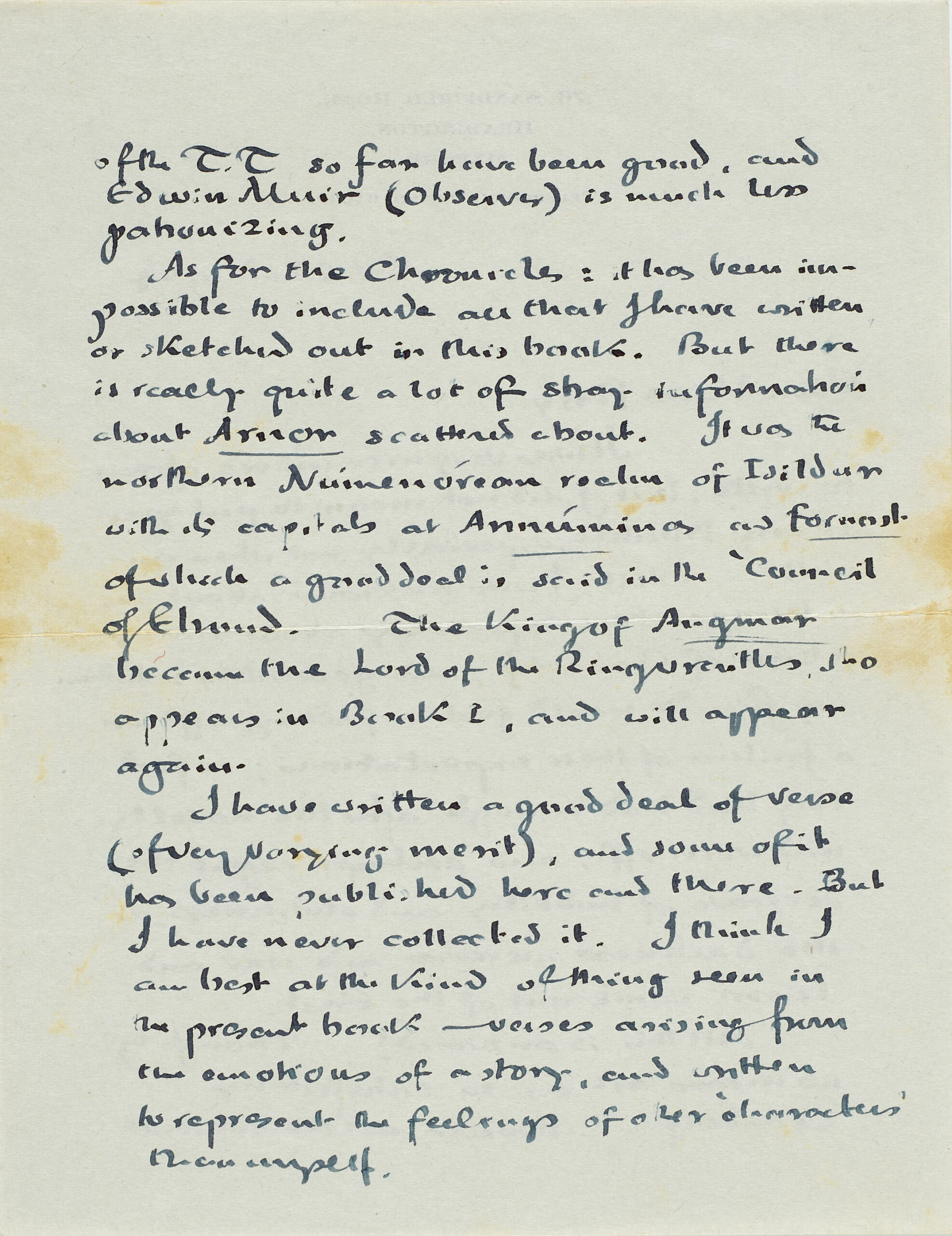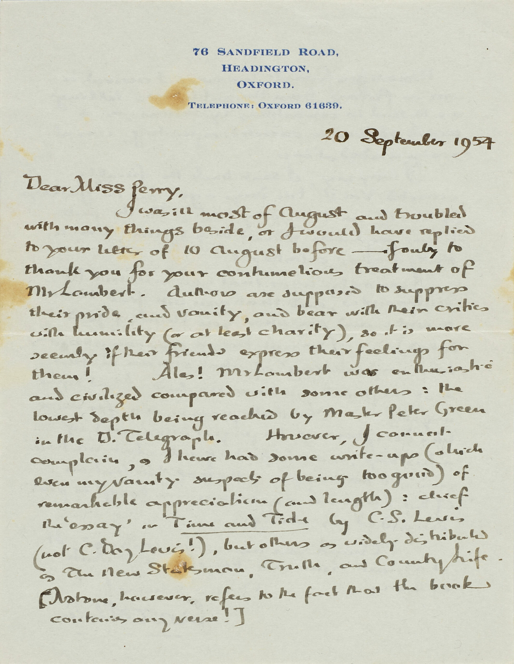 Le lettere autografe di Tolkien fanno spesso capolino in aste prestigiose, tanto che ogni anno abbiamo notizia di qualche supposto inedito che viene proposto per l’acquisto ai collezionisti. Il record è detenuto da una missiva del 3 agosto 1943, in cui Tolkien spiega lo sviluppo delle lingue e delle rune utilizzate nello Hobbit, il suo romanzo d’esordio, venduta da Christie’s a New York il 6 ottobre 2022 per 107.100 dollari. Definita la “Stele di Rosetta della Terra di Mezzo”, questa lettera non era però inedita, visto che era già stata acquistata il 4 maggio 1995 a un’asta di Sotheby’s. Non è raro che il mondo tolkieniano si infiammi di fronte a notizie del genere, anche se spesso molti documenti sono già conosciuti dagli studiosi o dagli appassionati più vigili. In particolare, Hammond e Scull includono già nella loro Chronology qualche lettera di Tolkien indirizzata alla signora Perry: due lettere del 6 e dell’8 agosto 1954, in cui Tolkien replica alla prima recensione entusiastica mai inviatagli della La Compagnia dell’Anello da parte di un lettore o lettrice; una lettera del 28 settembre 1955, dalla quale traspare che Tolkien avesse inviato alla signora Perry una versione di prova del Ritorno del Re; e una lettera del 29 dicembre 1961 in cui Tolkien si scusa per non avere risposto ad alcune missive a causa della confusione che regna tra le sue carte e della ormai debole memoria, che non gli permette di ricordare gli indirizzi. Le lettere incluse nell’asta di Bonhams’ non sono citate dai due studiosi e aggiungono dettagli interessanti sul rapporto epistolare che intercorse per molti anni tra Tolkien e Miss Perry. Esse contengono anche passaggi notevoli che possono arricchire l’immagine di Tolkien scrittore e uomo, nonché il processo compositivo che lo ha condotto alla pubblicazione del Signore degli Anelli.