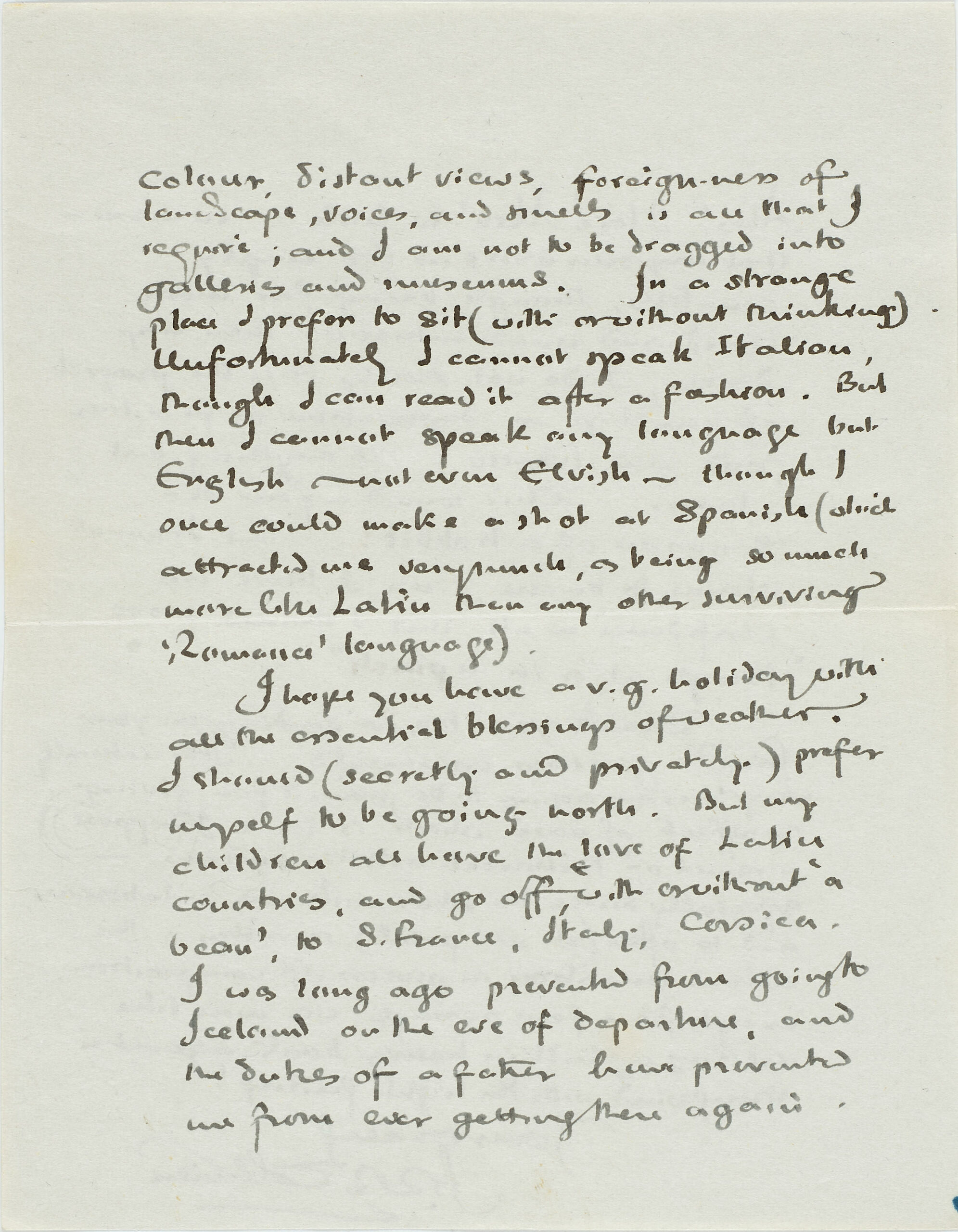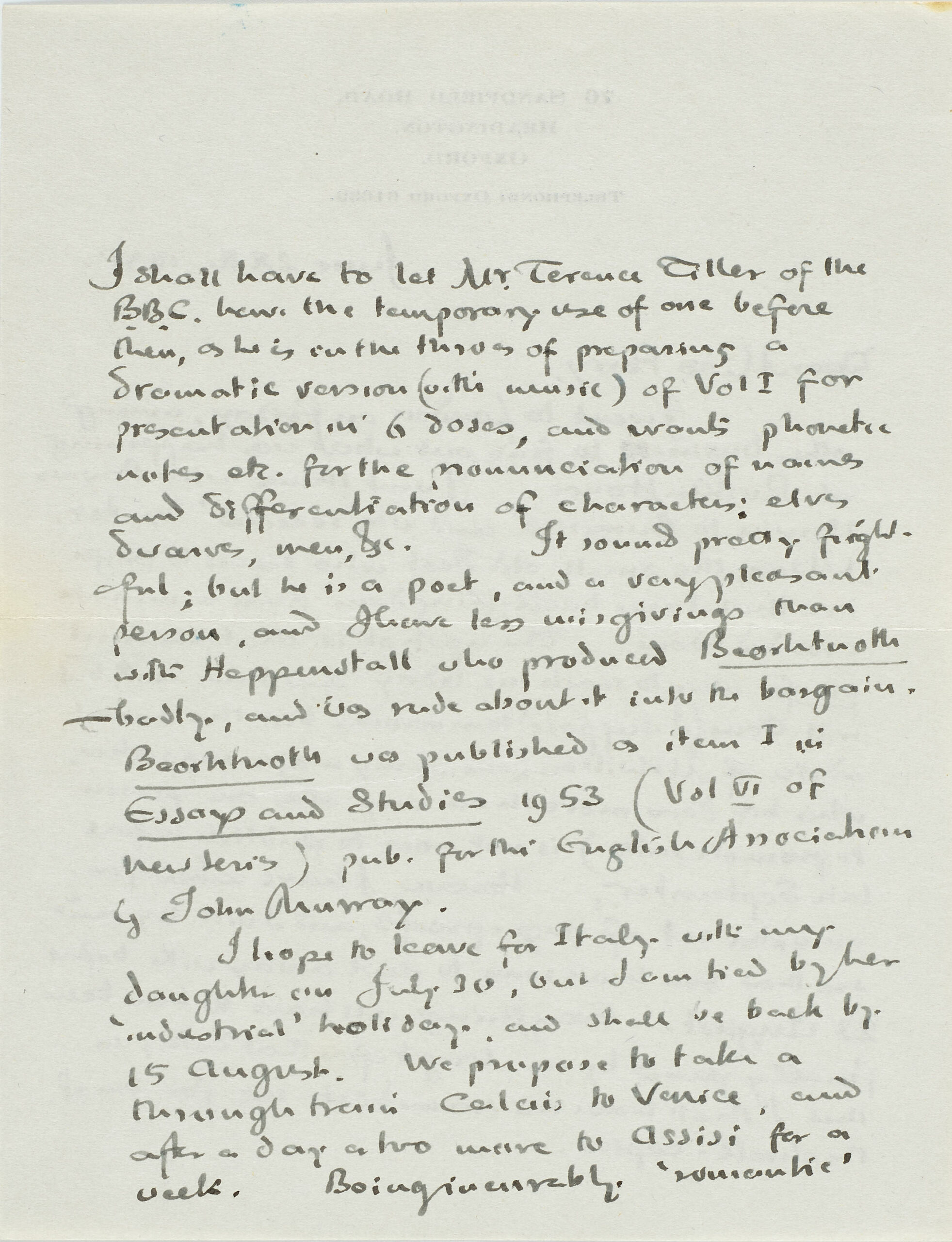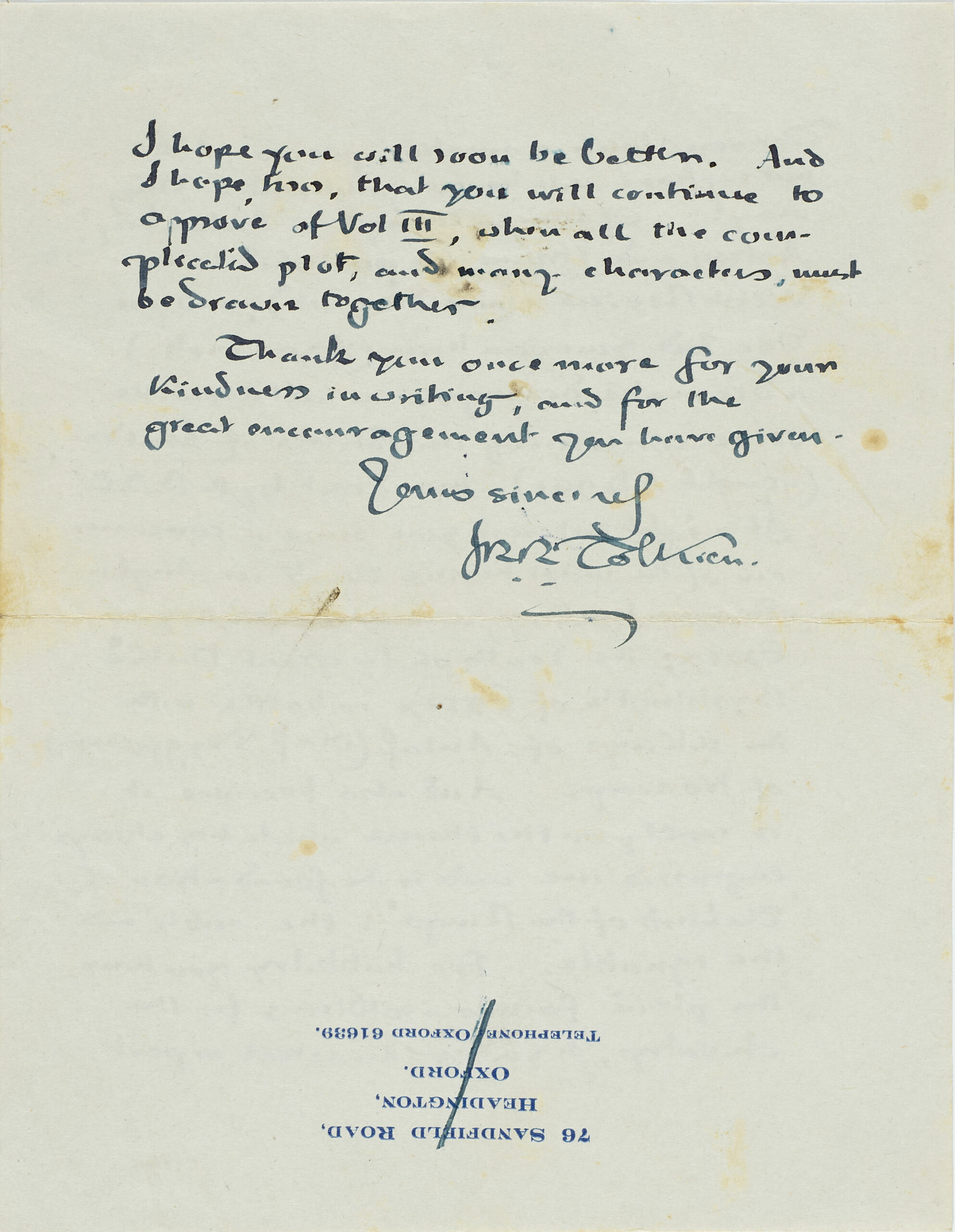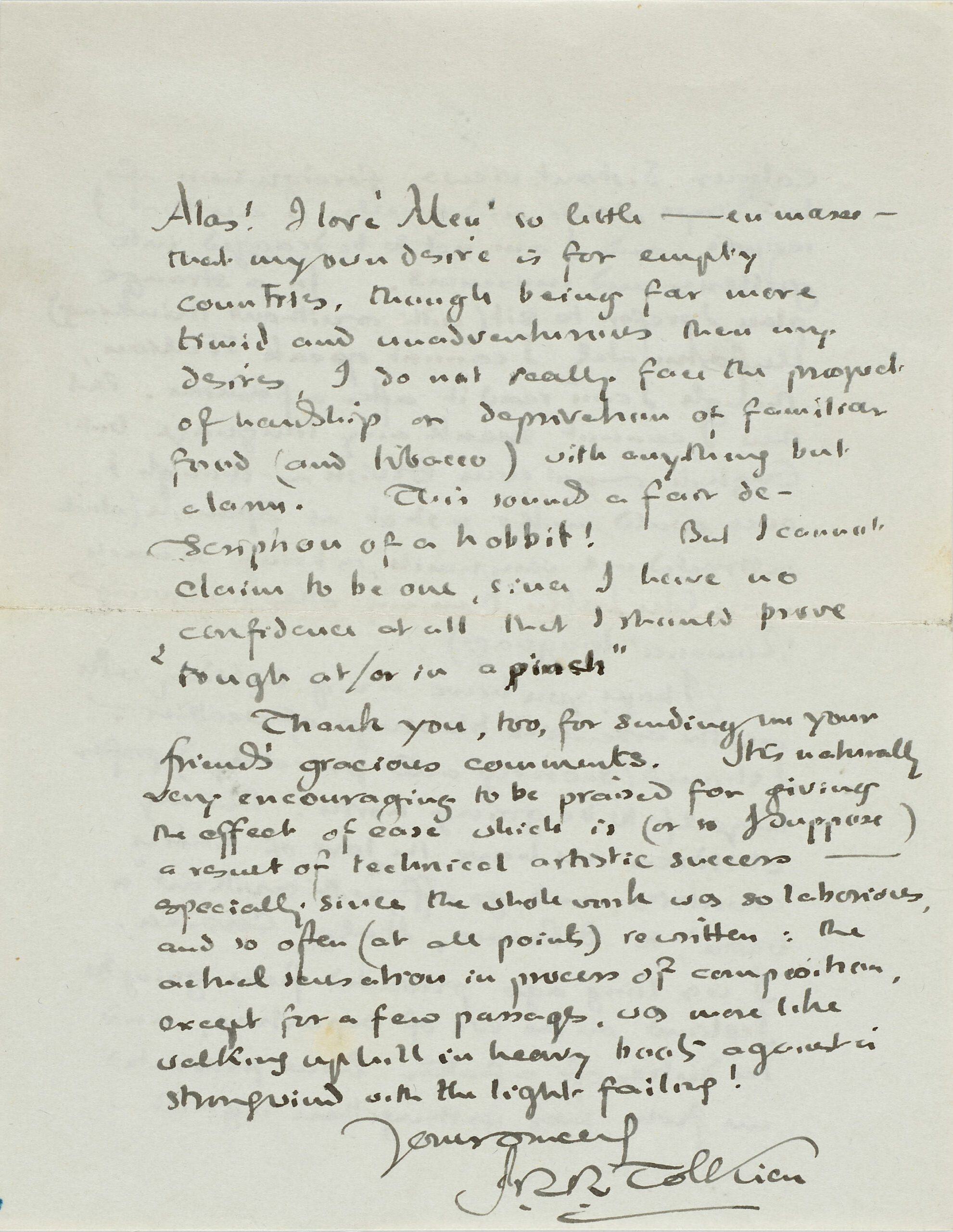 È stato soprattutto il lotto 153, la lettera datata 28 giugno 1955, ad attrarre i collezionisti: ben 4 pagine in cui Tolkien racconta della visita presso la celebre libreria Bumpus insieme a Rayner Unwin, delle difficoltà incontrate nella stesura del Signore degli Anelli, del suo sentirsi in tutto e per tutto uno Hobbit e… dell’imminente viaggio in Italia insieme alla figlia Priscilla. «Spero di partire in Italia con mia figlia il 30 luglio, ma sono vincolato alle ferie lavorative, e dovrò essere di ritorno per il 15 di agosto. Intendiamo prendere un treno diretto da Calais a Venezia, e dopo un giorno o due spostarci ad Assisi per una settimana. […]e non mi farò trascinare in gallerie o musei. In un luogo che non conosco preferisco starmene seduto (senza pensieri o riflettendo). Sfortunatamente non so parlare italiano, anche se in un certo qual modo lo so leggere.». Tolkien avrebbe poi raccolto pensieri e impressioni sull’Italia in un piccolo diario di viaggio. La parte più succulenta della lettera è sicuramente quella in cui dichiara di non amare i luoghi affollati, ma di preferire le “regioni disabitate”, anche se la sua indole poco incline all’avventura e alle privazioni (soprattutto del cibo “familiare” e del tabacco) gli avrebbe fatto vivere con grande disagio l’allontanamento dalle abitudini quotidiane. Proprio come uno Hobbit! Invece, per quanto riguarda la sensazione di “scorrevolezza” che lo stile del Signore degli Anelli trasmetteva alla signora Perry, Tolkien confessa che la scrittura del suo capolavoro è stata “laboriosa” in quanto soggetta a numerose riscritture: «[…]la reale sensazione durante il processo di composizione, a parte qualche sparuto passaggio, rassomigliava piuttosto a una scarpinata in salita con stivali pesanti ai piedi, contro un vento tenace e con la luce che andava affievolendosi!». Anche nella precedente lettera del 20 dicembre 1954, lotto 151 dell’asta, venduto per 16.640 dollari, Tolkien parla del processo compositivo del Signore degli Anelli. Egli sostiene che, durante la scrittura, non capiva bene cosa stesse facendo, visto che il suo enorme sforzo creativo era più simile alla decifrazione di pagine disordinate di una storia già scritta, piuttosto che all’invenzione ex novo di materiale narrativo originale. Anzi, tutto ciò che egli percepiva come “invenzione” alla fine veniva scartato perché ritenuto errato.