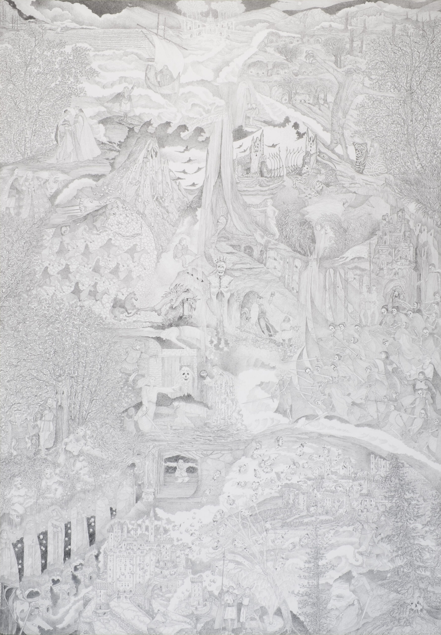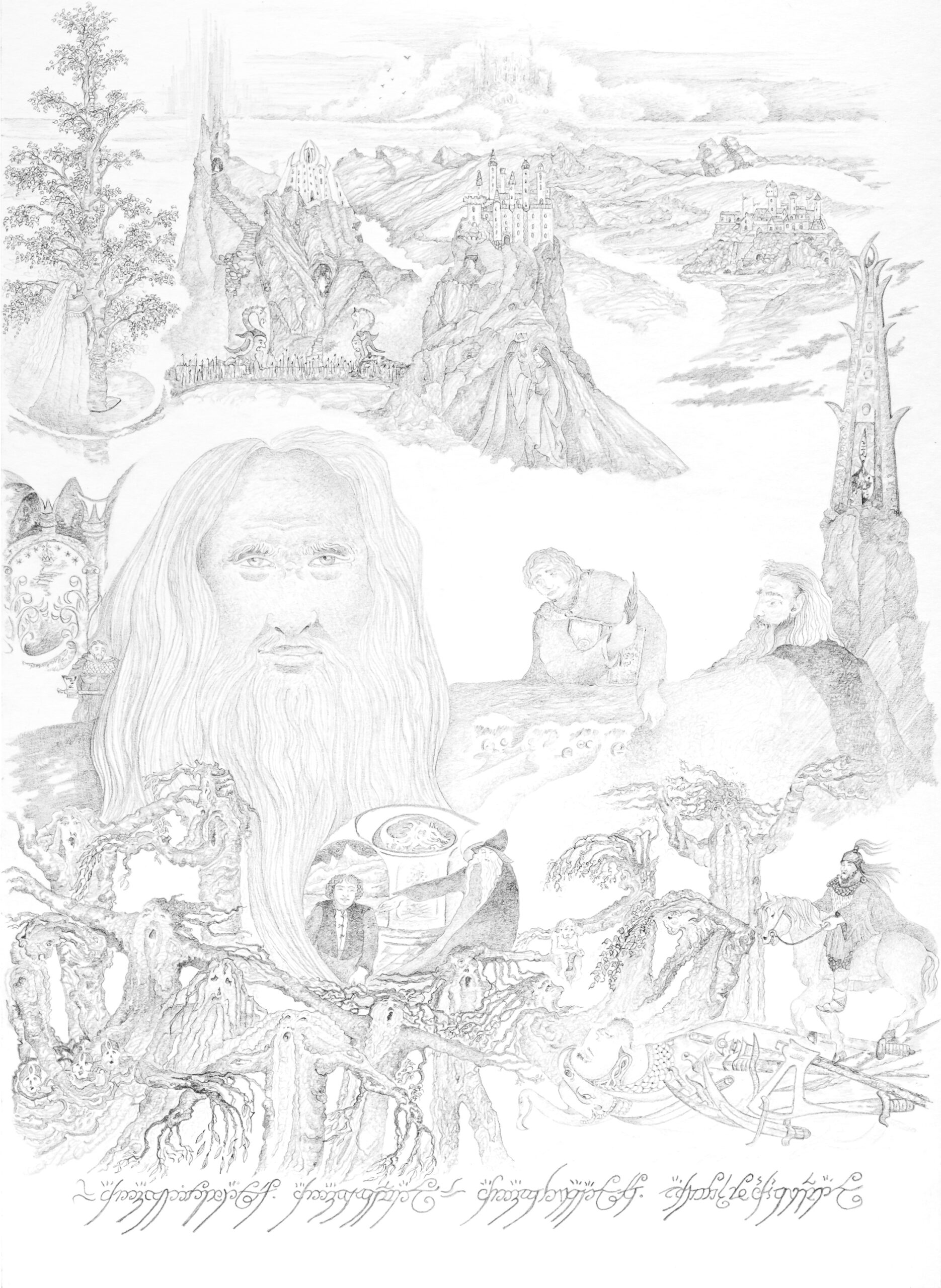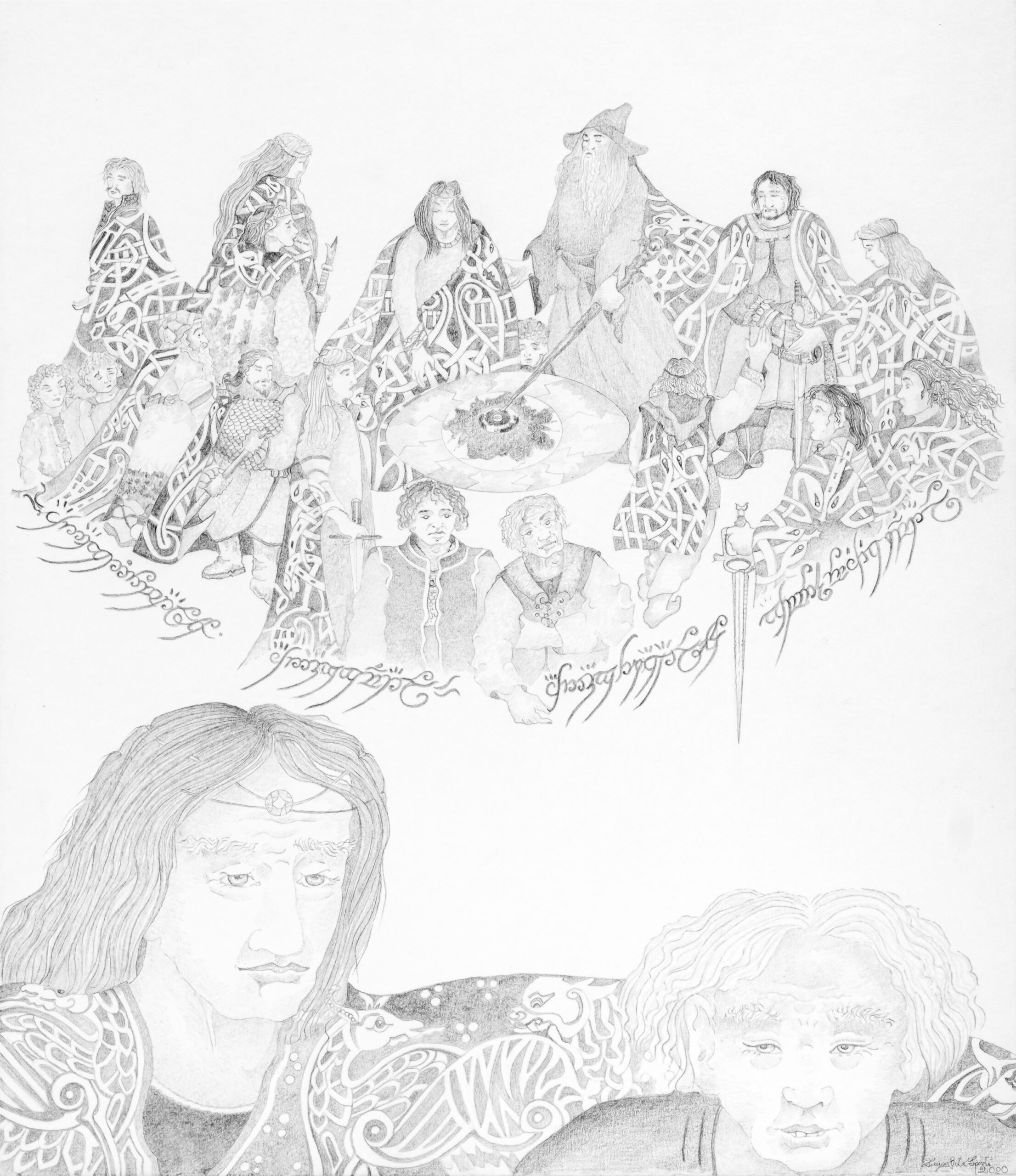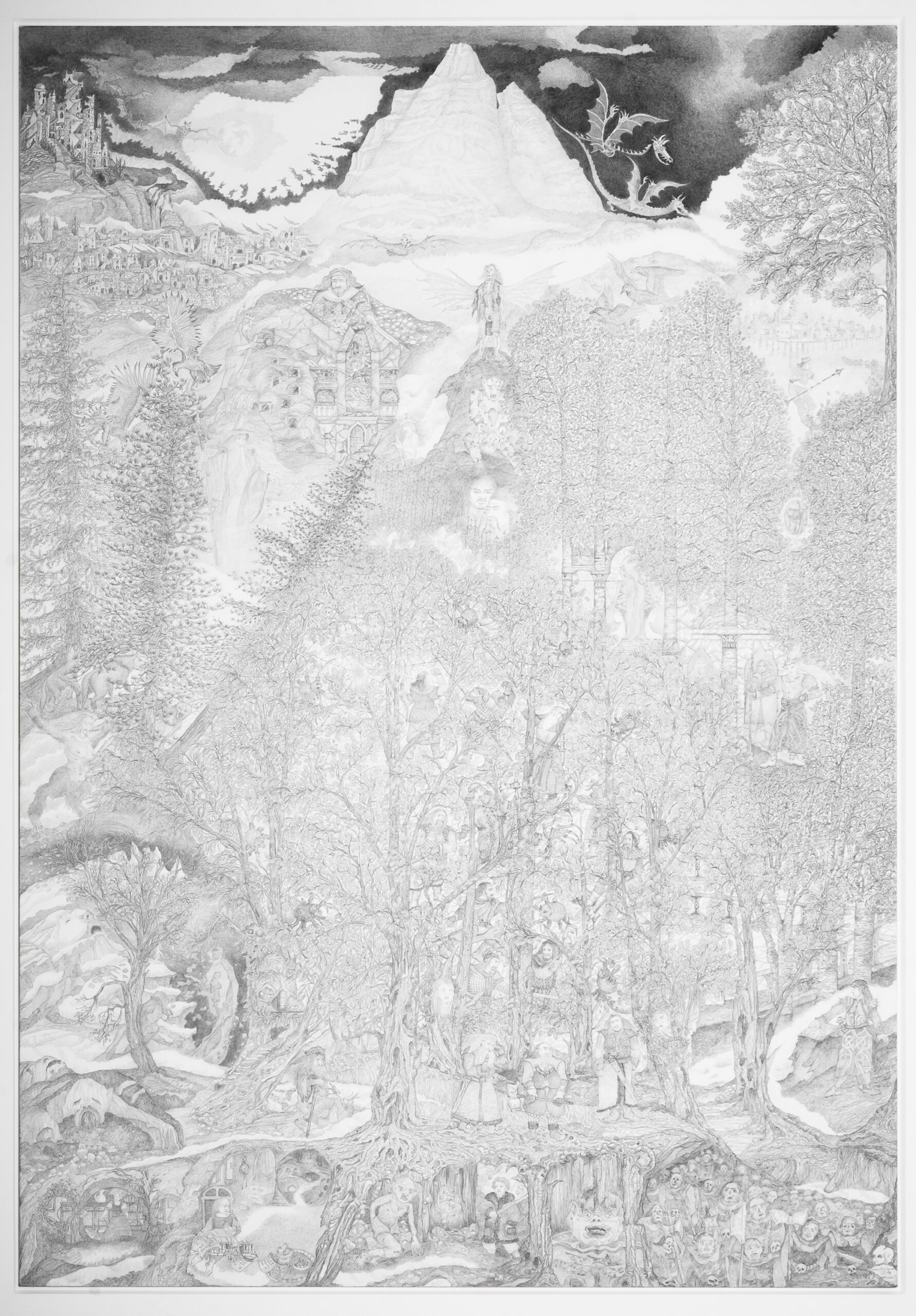 «Ho iniziato a lavorare su Tolkien nei primi anni ’80 realizzando un ciclo di 33 opere (acquarelli e matite su cartoni Shoeller) dedicate a Il Signore degli Anelli», racconta Luisa Rota Sperti. In questa fase pittorica, però, il suo tema principale è la montagna: l’ascesa fisica, l’ascesa spirituale. È la montagna dell’iniziazione, della prova magica la figura determinante di questo grande ciclo (1979-1982, in 33 tavole). «All’inizio del nuovo millennio, dopo un lungo periodo dedicato a montagne e alpinisti, ho ripreso la tematica tolkieniana con 44 opere ispirate a Il Signore degli Anelli, al Silmarillion, allo Hobbit e ai Racconti perduti. Nelle grandi tavole ho privilegiato raccontare con la matita paesaggi e architetture, mentre in quelle più piccole ho intrecciato questi elementi con i volti dei personaggi che animano le storie e ne sono protagonisti». conculed, infine, l’artista dicendo: «Rispetto ai libri che mi hanno e continuano a ispirarmi, ho i volumi originali in inglese e diverse e differenti traduzioni fin da quell’edizione in italiano del 1971 in cui gli Elfi erano Gnomi».