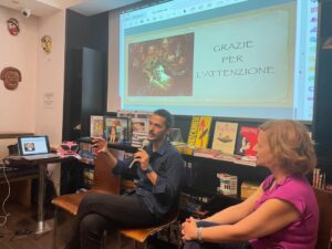Un soffitto illuminato da lampadine, piccole come stelle, rilassano gli avventori, le balaustre che corrono al piano superiore danno idea di ricchezza, numerosità ed eterogeneità dei libri offerti. Spiccano ovviamente fin dall’entrata quelli del professore nel cinquantesimo del suo passaggio da questo mondo. Chi passava invece si è fermato per partecipare all’incontro che assieme alla presidente Nancy Antonazzo siamo riusciti a rendere fresco e coinvolgente senza dimenticare la giusta dose di ironia.