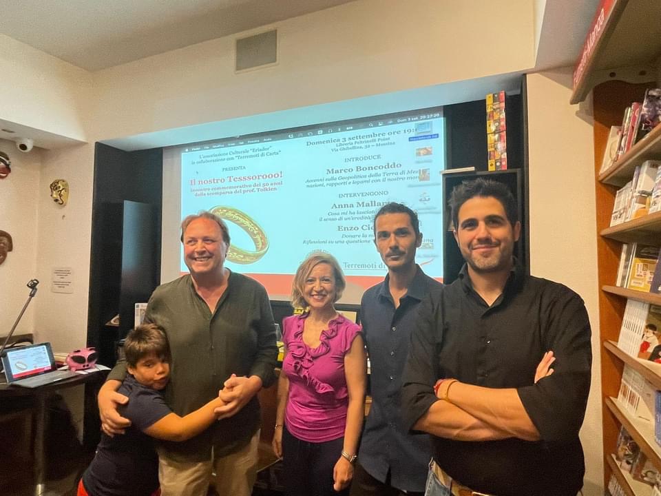 La due giorni di incontri Il nostro Tesssorooo!, organizzata a Messina dall’Associazione Culturale “Eriador” in collaborazione con ”Terremoti di Carta. Il primo incontro, tenutosi il 2 settembre alla Libreria Mondadori, ha visto la presentazione del libro di Saverio Simonelli, Un uomo di parola. I mondi fantastici di Tolkien (Ancora, 2023). Ha dialogato con l’autore Nancy Antonazzo, presidente di “Terremoti di Carta” nonché fondatrice e referente di “Eriador”.
