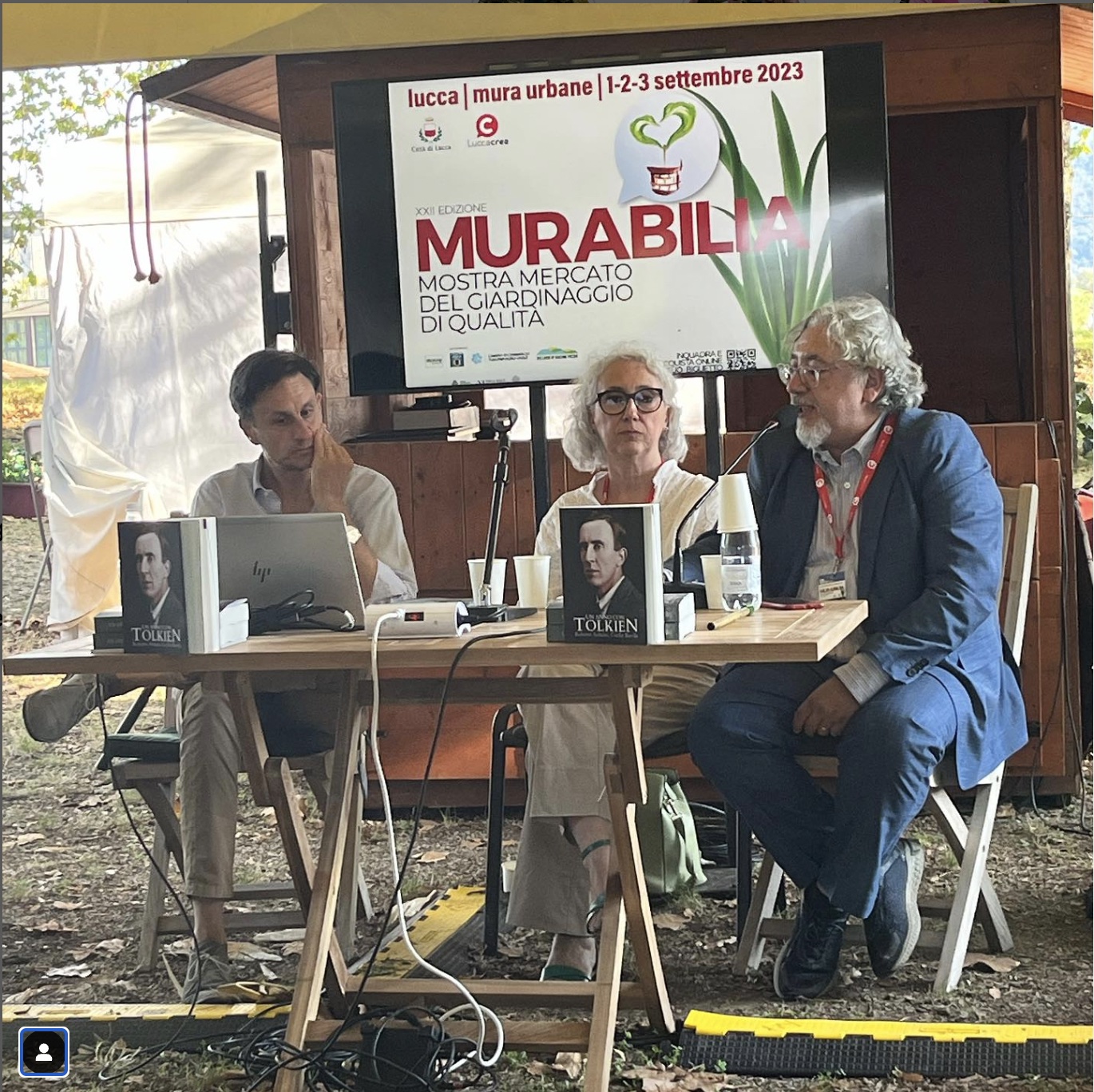 Intanto a Lucca si svolgeva (dal 1 al 3 settembre) l’evento Murabilia con due incontri, entrambi al sabato 2 settembre, il giorno esatto dell’anniversario dello scrittore inglese, presso lo spazio incontri del Baluardo San Regolo: alle ore 17 – Un tè con J.R.R. Tolkien con Cecilia Barella e Roberto Arduini, moderati da Emanuele Vietina, direttore di Lucca Comics and Games, con il contributo della Federazione Italiana Pasticceria Gelateria Cioccolateria); subito dopo alle ore 18 un bel momento musicale con un concerto d’arpa del noto artista Arthuan Rebis, autore un romanzo molto tolkieniano dal titolo Helughèa – il racconto di una Stella Foglia. Ecco il commento di Cecilia Barella: «Sebbene mi sia dispiaciuto non aver raggiunto a Dozza per il Cinquantenario, sono stata davvero molto contenta di aver celebrato Tolkien il 2 settembre a Lucca, con Roberto Arduini ed Emanuele Vietina, direttore di Lucca Comics e anch’egli socio Aist, nell’ambito di Murabilia.