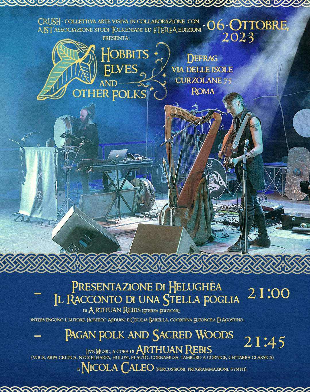 A partire dalle 21.00 di venerdì 6 ottobre, il festival avrà il piacere di ospitare la presentazione del libro Helughèa – Il Racconto di una Stella Foglia di Arthuan Rebis, edito da Eterea Edizioni, a cui seguirà Pagan Folk and Sacred Woods – Live Music, concerto intrinsecamente connesso alle poetiche ed estetiche del libro, a cura del duo composto da Arthuan Rebis (voce, arpa celtica, nyckelharpa, hulusi, flauto, cornamusa, tamburo a cornice, chitarra classica) e Nicola Caleo (percussioni, programmazioni, synth). Il romanzo, definito come «il fantasy ecologista di Arthuan Rebis», è ricco di suggestioni che rielaborano, attraverso la lente degli immaginari fantastici, tradizioni e miti che hanno narrato di un rapporto il più possibile armonico tra l’umano e la natura. Un impianto filosofico-spirituale che è arricchito per giunta dal lavoro musicale di Arthuan Rebis (pseudonimo dell’eclettico scrittore-musicista-ricercatore Alessandro Cucurnia, noto anche per essere autore, musicista, cantante e produttore della band In Vino Veritas, tra le più importanti realtà europee in ambito folk medievale e pagano): esiste infatti un intero album, Canti di Helughèa, per accompagnare i lettori, traccia dopo traccia, anche grazie a un pratico QR Code presente all’interno del testo.