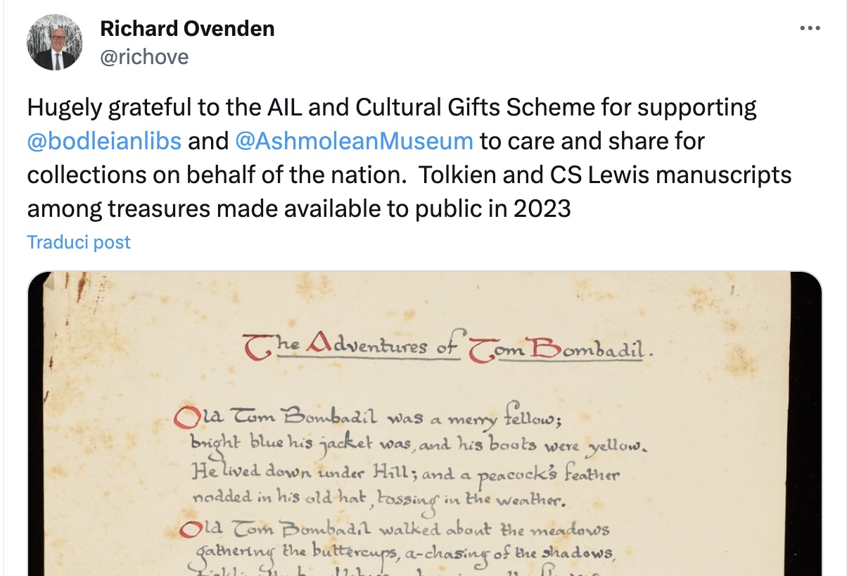 Un tesoro di inestimabili manoscritti e lettere scritti dai J.R.R. Tolkien e C.S. Lewis è stato generosamente donato al pubblico dominio dalla famiglia di un collezionista privato. Questa mossa significativa è stata orchestrata come parte di un accordo con il governo per eludere le passività fiscali dovute per la successione. Gli oggetti donati contengono bozze di opere famose di entrambi gli autori, corrispondenza personale e altri documenti che forniscono una visione unica del loro processo creativo e della loro amicizia. Questi tesori sono stati protetti attraverso il programma Acceptance in Lieu (AiL).