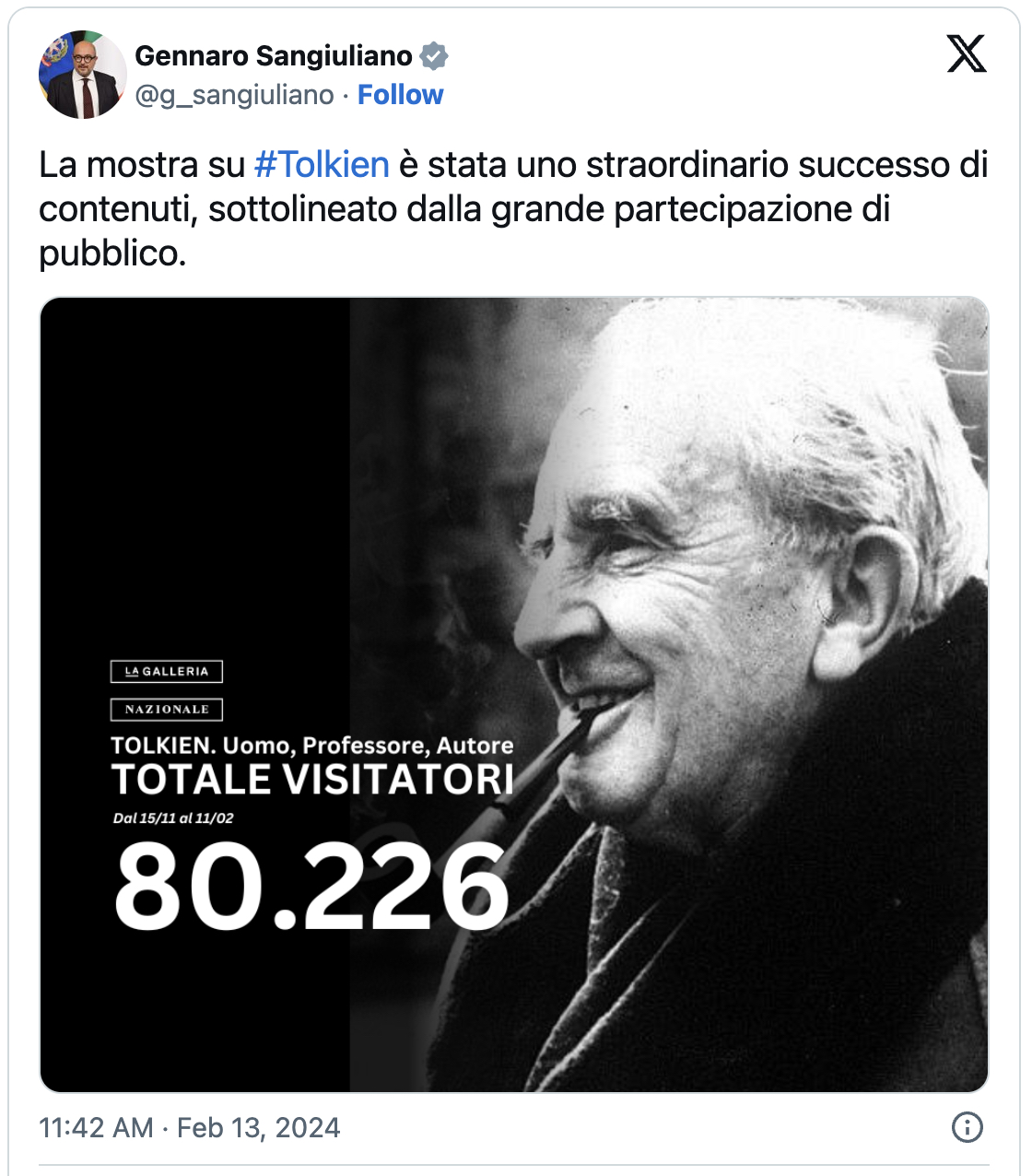 Si è chiusa domenica con numeri notevoli per l’Italia la mostra Tolkien: Uomo, Professore, Autore alla Galleria Nazionale d’Arte Moderna e Contemporanea, ideata e promossa dal Ministero della Cultura in collaborazione con l’Università di Oxford. Esulta Gennaro Sangiuliano: «La mostra su Tolkien è stata uno straordinario successo di contenuti, sottolineato dalla grande partecipazione di pubblico, molti visitatori in più di quanti vanno alla Galleria Nazionale di Arte Moderna». Dopo Roma, la mostra su Tolkien farà un mini-tour della penisola. L’esposizione alla GNAM si è conclusa l’11 febbraio 2024, ma proseguirà a Napoli, Torino e Catania. A Napoli, l’esposizione si terrà dal 15 marzo al 15 giugno presso il Palazzo Reale che, per l’occasione, aprirà nuovi spazi espositivi da poco rinnovati, le sale Belvedere. A Torino, la mostra sarà esposta presso la Reggia di Venaria Reale, dall’autunno 2024 fino all’inizio del 2025.