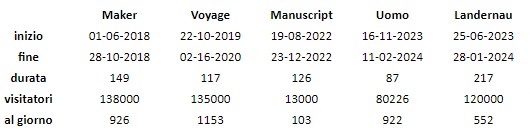Siccome un articolo sul Corriere della Sera appena uscito ricorda che più che i numeri assoluti, per valutare il successo di una mostra valgono di più i dati sulla media giornaliera di presenze, è bene dare uno sguardo anche a quel numero. In questo caso, seppur i numeri assoluti e di media giornaliera sono molto lontani rispetto alle altre grandi esposizioni su