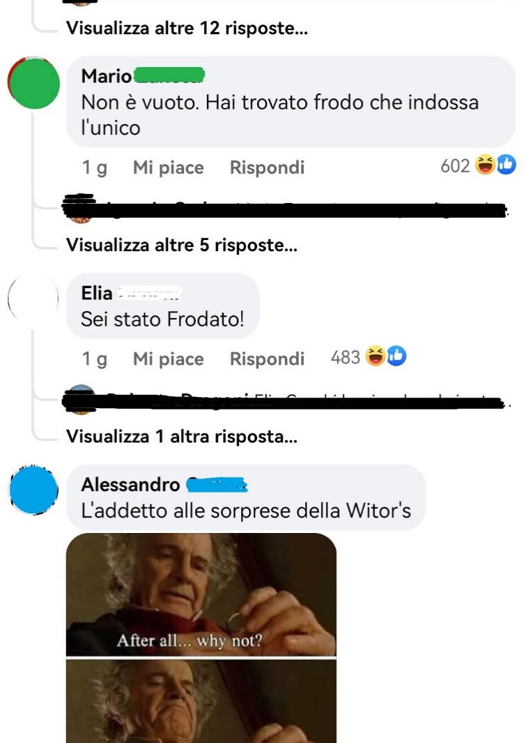 C’è chi paragona l’addetto di Witor’s all’inserimento delle sorprese nelle uova a Bilbo che non vuole separarsi dall’Anello Unico, chi utilizza una celebre frase di Gollum per rappresentare il sentimento che deve aver provato l’utente che ha aperto l’uovo e l’ha trovato vuoto («Ce l’hanno tolto, rubato!») e chi prende in causa Frodo con poco fortunati giochi di parole, anche se azzeccati. Un’utente suggerisce di usare la parola segreta prima di aprirlo per evitare sorprese (no pun intended) e chi cita Gandalf con frasi solitamente considerate acute – il consiglio a Frodo quando si trovano nelle Miniere di Moria e hanno temporaneamente smarrito la strada – o emozionanti –