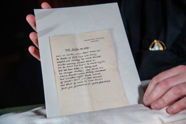 Sarah Prescott, archivista delle collezioni speciali dell’Università di Leeds, ha dichiarato: «La Collezione Tolkien-Gordon è un’acquisizione relativamente recente per la Biblioteca universitaria e ha colmato una lacuna nel nostro patrimonio sul periodo trascorso da Tolkien a Leeds, un argomento di perenne interesse per i ricercatori. Essa fornisce una visione approfondita del lavoro di sviluppo di Tolkien e dell’impatto che le relazioni durature formate all’Università avrebbero avuto su di lui. Ha inoltre consentito ai ricercatori di esplorare il ruolo di E.V. Gordon e della moglie Ida, sia come amici di Tolkien, sia come importanti studiosi a pieno titolo. Questa entusiasmante scoperta del dottor Cossio fa davvero rivivere il valore di questo periodo a Leeds: siamo molto entusiasti di poter affermare che abbiamo anche una poesia originale di C.S. Lewis nelle nostre collezioni! Non vediamo l’ora di accogliere più persone nelle Collezioni speciali per studiare la Collezione e vedere quali ulteriori approfondimenti si possono trovare».