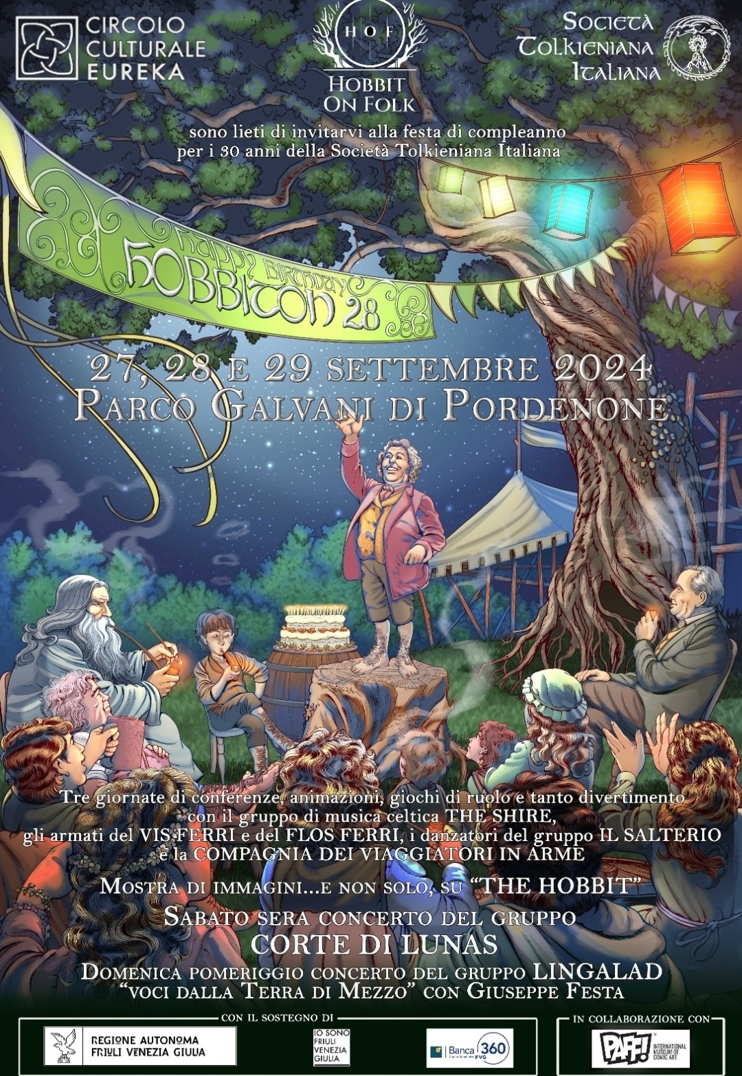 Torna a distanza di 2 anni l’appuntamento tradizionale della Società Tolkieniana Italiana (STI), che in questa occasione festeggia i suoi 30 anni di attività. Questa manifestazione, che ha accompagnato la storia della STI sin dalla sua nascita, nel 1994, ha viaggiato per tutta Italia, da San Daniele del Friuli a Barletta, cambiando numerose volte location. La ventottesima edizione della Hobbiton, organizzata in collaborazione con il Circolo Culturale Eureka, si svolgerà all’interno del Parco Galvani di Pordenone tra il 27 e il 29 Settembre 2024. Per l’occasione sono previste una mostra, una serie di conferenze e svariate altre attività.