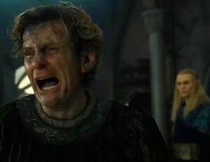 In ogni caso, questa soluzione ci conduce al tanto atteso confronto tra Celebrimbor e Annatar: il Signore dei Doni svela infine la propria identità e mostra al suo ormai ex-socio che il mithril utilizzato per i Nove altro non era che il proprio sangue (ma allora tutta la lore creata ad hoc sul prezioso metallo nanico tanto necessario per gli altri Anelli che senso aveva? Perchè Sauron non ha adoperato sin da subito questo espediente che – se interpreto bene il pensiero degli showrunner – gli avrebbe assicurato il pieno controllo su tutti gli Anelli?). Crollata l’illusione di Annatar, Celebrimbor scopre alla buon’ora che la battaglia infuria nell’Eregion e corre dai suoi sudditi per rivelare la verità; naturalmente, nessuno di loro gli crede e i suoi goffi tentativi di convincere Mirdania (ormai follemente innamorata del bel biondino) si concludono con una specie di trucchetto jedi di Sauron, tale da far sembrare che sia proprio il fabbro elfico a gettarla giù dalle mura. Degna fine di un personaggio che muore come è vissuto: inutilmente. Rinchiuso nuovamente nella forgia, il povero signore dell’Eregion riacquista risolutezza e tenta di distruggere i Nove solo per accorgersi che essi non possono essere fusi (occorrerà informare gli showrunner che questa è una prerogativa esclusiva dell’Unico Anello e che gli altri Anelli possono effettivamente essere distrutti – come lo sono stati quattro di quelli in mano ai Nani). La soluzione, allora, è portarli al sicuro il più lontano possibile, così Celebrimbor è costretto a mutilarsi una mano per liberarsi delle catene che lo avvinghiano. Nelle intenzioni degli autori, questa scena degna di Saw dovrebbe mostrare tutta la determinazione del fabbro elfico («Chi ha la volontà più ferrea?») ma sortisce l’effetto involontariamente comico di mostrarlo – lui che è secondo solo a Fëanor – del tutto incapace di forzare una semplice manetta. A questo punto, il fatto che Galadriel lo liberi dai suoi stessi soldati – i quali ora inneggiano ad Annatar “signore dell’Eregion” – affermando che «si tratta di Lord Celebrimbor, il più grande dei fabbri elfici» suona di presa per i fondelli. Segue un patetico momento di autoaiuto (proprio l’ideale nel furore della battaglia) in cui entrambi si confessano di aver sempre saputo in cuor loro la verità su Annatar e Galadriel ammette che è tutta colpa sua: è già qualcosa, tutto sommato. E non c’è che dire: Celebrimbor la prende davvero bene, come se la distruzione del suo meraviglioso reame causata dall’elfica Karen fosse poca roba, ed anzi la scongiura di portar via i Nove ed evacuare i superstiti, mentre lui condividerà il destino della città ormai in fiamme. Ovviamente, gli stessi soldati che prima lo volevano agguantare ora sono pronti al sacrificio con lui. Bene ma non benissimo.