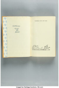 Nella collezione di William Strutz ci sono anche tre volumi di Tolkien. Ognuno di essi racconta una storia. Il primo è quello che è divenuto Lo Hobbit più prezioso al mondo, una prima edizione del romanzo che ha raggiunto i 300.000 dollari nell’asta dello scorso 27 giugno. Stampata nel 1937 è una di quelle copie di presentazione data dall’editore allo scrittore inglese e regalate da quest’ultimo ad amici, colleghi e parenti. La copia si presenta in uno stato ottimale con una sovraccoperta superlativa, una tavola in mezzatinta inserita dall’autore oltre le otto canoniche, e anche un foglio pubblicitario integrale alla fine. Tela verde dell’editore originale timbrata in blu, risguardi bianco sporco stampati con la mappa di Thror e una mappa delle Terre Selvagge da disegni dell’autore, bordo superiore macchiato di verde; sovraccoperta illustrata originale da un disegno dell’autore, con “Dodgeson” corretto a mano sul risvolto posteriore; custodito in un cofanetto realizzato a mano a cura di un precedente proprietario. La dedica sul risguardo anteriore è di Tolkien: «A Charles e Dorothy Moore / da / J.R.R.T. / con amore / settembre 1937». Secondo Wayne G. Hammond, Dorothy Moore era una vecchia amica della moglie di Tolkien, Edith. Nella nuova edizione delle Lettere di Tolkien (2023), “Dorothy e Charlie Moore” sono descritti come “amici di famiglia” che vivevano a Exeter, Devon, in relazione a una vacanza che il figlio più giovane dei Tolkien, Christopher, trascorse con loro. Dorothy morì nei primi anni ’40; i Tolkien rimasero in contatto con Charles ma persero i contatti con lui intorno al 1955.