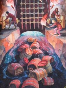 A volte sembra quasi che Tolkien voglia trasmetterci i suoni di ciò che accade, e allora, ad esempio, nella scena in cui i barili vengono fatti rotolare nel fiume sotterraneo attraverso la botola delle cantine degli Elfi, c’è una sequenza di verbi come questa: «thudding», «smacking», «jostling», «knocking», «bobbing»… che purtroppo non trovano tutti un effetto altrettanto “sonoro” in italiano. Io non sono riuscito a fare di meglio di «cadendo», «schiantandosi», «andando a sbattere», «cozzando», «sobbalzando». Tant’è, la lingua ha i suoi limiti.