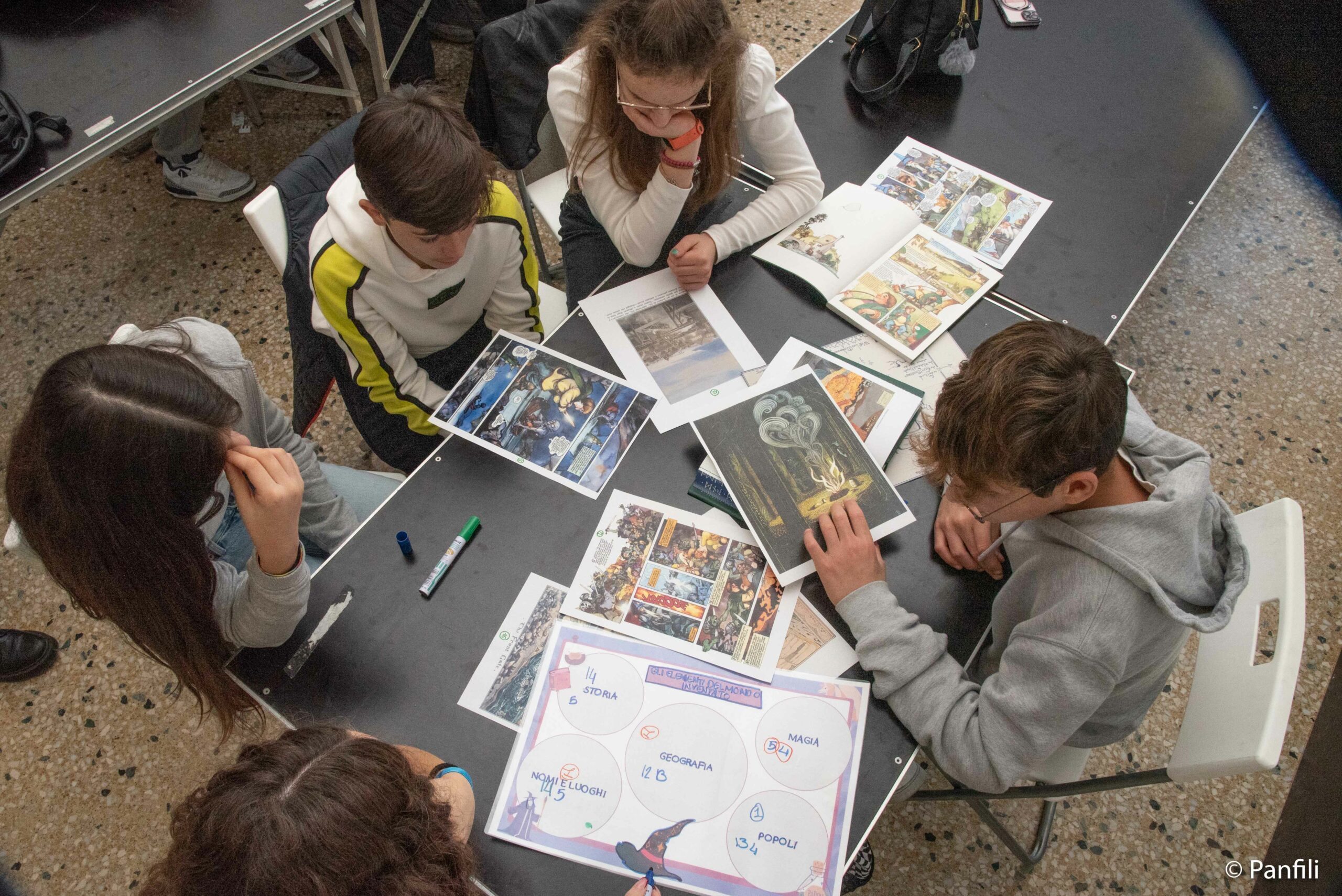 In particolare, da parte della terza media è stata fatta una riflessione molto interessante sul tipo di storia che viene raccontata: i ragazzi, infatti, si sono chiesti se la categoria si riferisse alla storia narrata (l’intreccio, per dirla in termini narratologici) o la storia dentro la storia. Questo si è rivelato molto utile per capire in quale categoria inserire l’illustrazione presa da Lo Hobbit a fumetti in cui i nani raccontano la storia del re Thrór e della Montagna Solitaria a Bilbo. Al contrario, con la quinta elementare sono venute a galla tutte le curiosità sulla geografia della Contea e sulle caratteristiche dei draghi. Rispetto a quest’ultimo particolare, i ragazzi si sono chiesti se un drago come Smaug potesse essere inserito nella categoria “popoli”. Hanno osservato che l’antropomorfizzazione del drago (il fatto che parli e che sia molto scaltro, per esempio) lo escluda automaticamente da una categoria addizionale come quella delle creature animalesche. Inoltre, i ragazzi hanno anche notato che la categoria “popoli” è una categoria collettiva e che, quindi, un singolo personaggio potrebbe non farne del tutto parte, a meno che non vengano citati altri componenti della stessa. Insomma, la giornata non poteva dare maggiori soddisfazioni. Anche se non tutti hanno partecipato attivamente, si è creata una stimolante atmosfera di scambio e interesse nei confronti della letteratura di Tolkien.