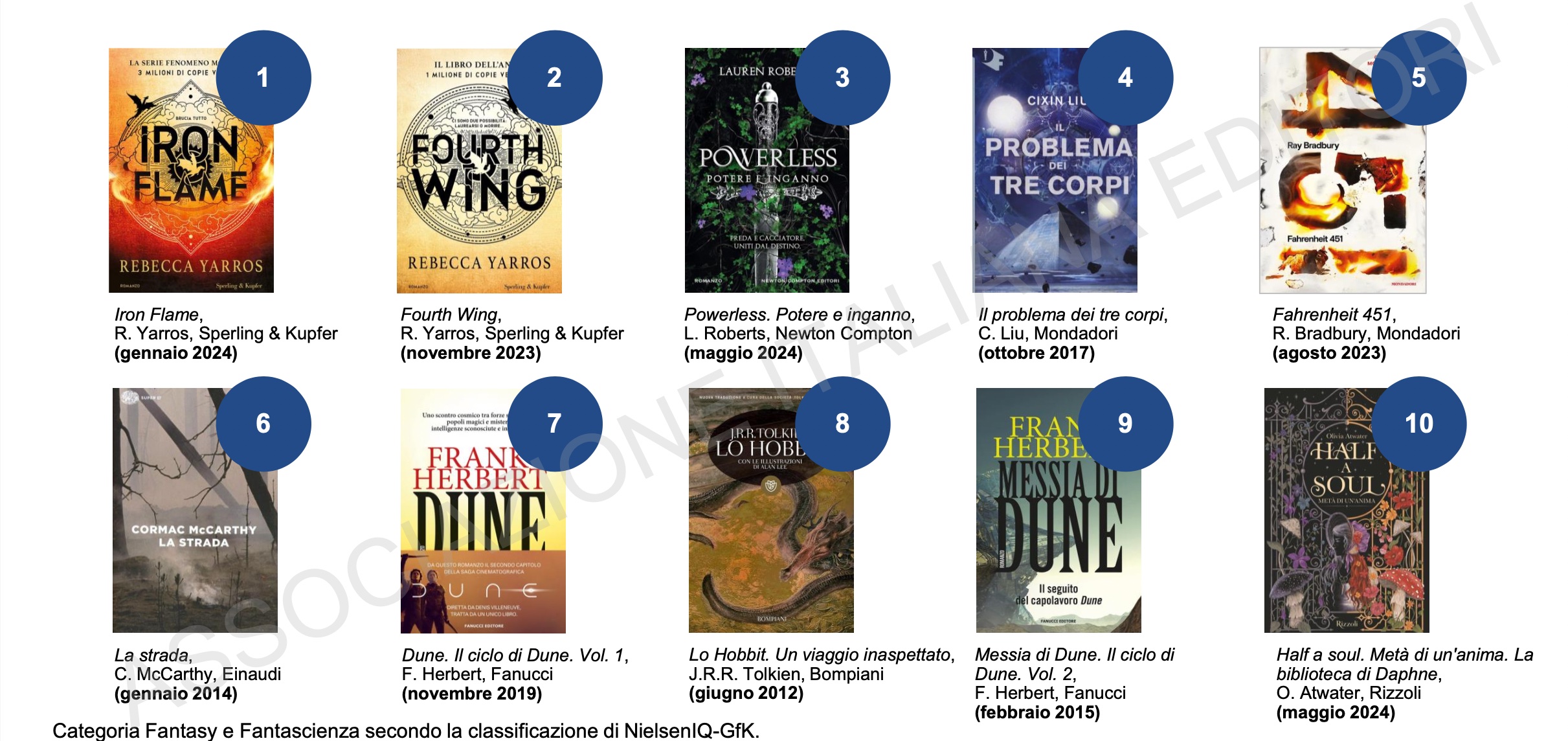 Dall’estero sono arrivate molte proposte di fantasy romantico e di distopie. La valutazione dei titoli distopici è particolarmente difficile da parte degli editori perché il rischio è che tali storie invecchino nel giro di pochi mesi; gli eventi degli ultimi anni (la pandemia e le guerre) hanno sorpreso il mondo e si sono succeduti con tanta rapidità da superare l’immaginazione degli scrittori che non siano in grado di dare profondità e prospettiva alle loro storie. È anche vero che l’aria dei tempi ha spinto verso il fantasy lettori che prima non si sarebbero avvicinati al genere, e ha portato i lettori di fantasy tradizionale verso romanzi dal tono distopico post apocalittico, come La strada di Cormac McCarthy (6° in classifica) che forse qualche anno fa non sarebbe rientrato nel genere.