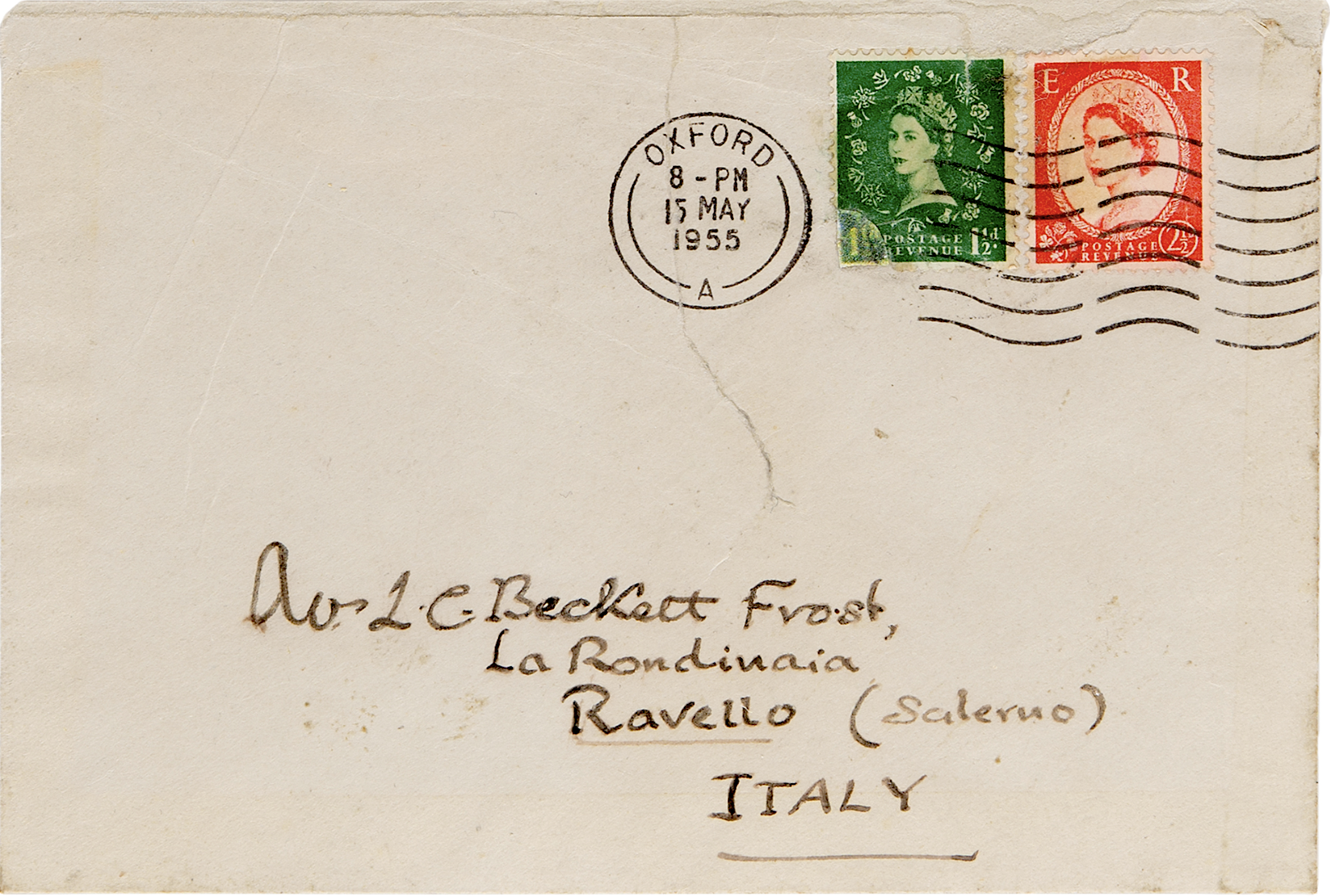 La lettera è indirizzata a Lucille Catherine Beckett, sposata Frost (1884–1979). Era la seconda figlia di lord Grimthorpe, Ernest William Beckett, quindi baronessa, ed è stata una filosofa e scienziata inglese. Unbounded Worlds (1959) e Neti Neti (1955) sono le sue opere più note, ma ha anche pubblicato Everyman and the Infinite (1922), The World Breath (1935), Movement and Emptiness (1968) e Insight and Solitude (1973). Ma la sorpresa è l’indirizzo, che non ha indicazioni precise sulla via o il numero civico. La lettera doveva arrivare senza altre indicazioni a destinazione perché il luogo è molto noto: Villa Rondinaia a Ravello. Lucille Catherine Beckett era proprietaria di Villa Cimbrone di cui all’epoca faceva parte anche la Rondinaia, edificata esclusivamente per lei. La villa è un piccolo gioiello prezioso e merita una piccola digressione.