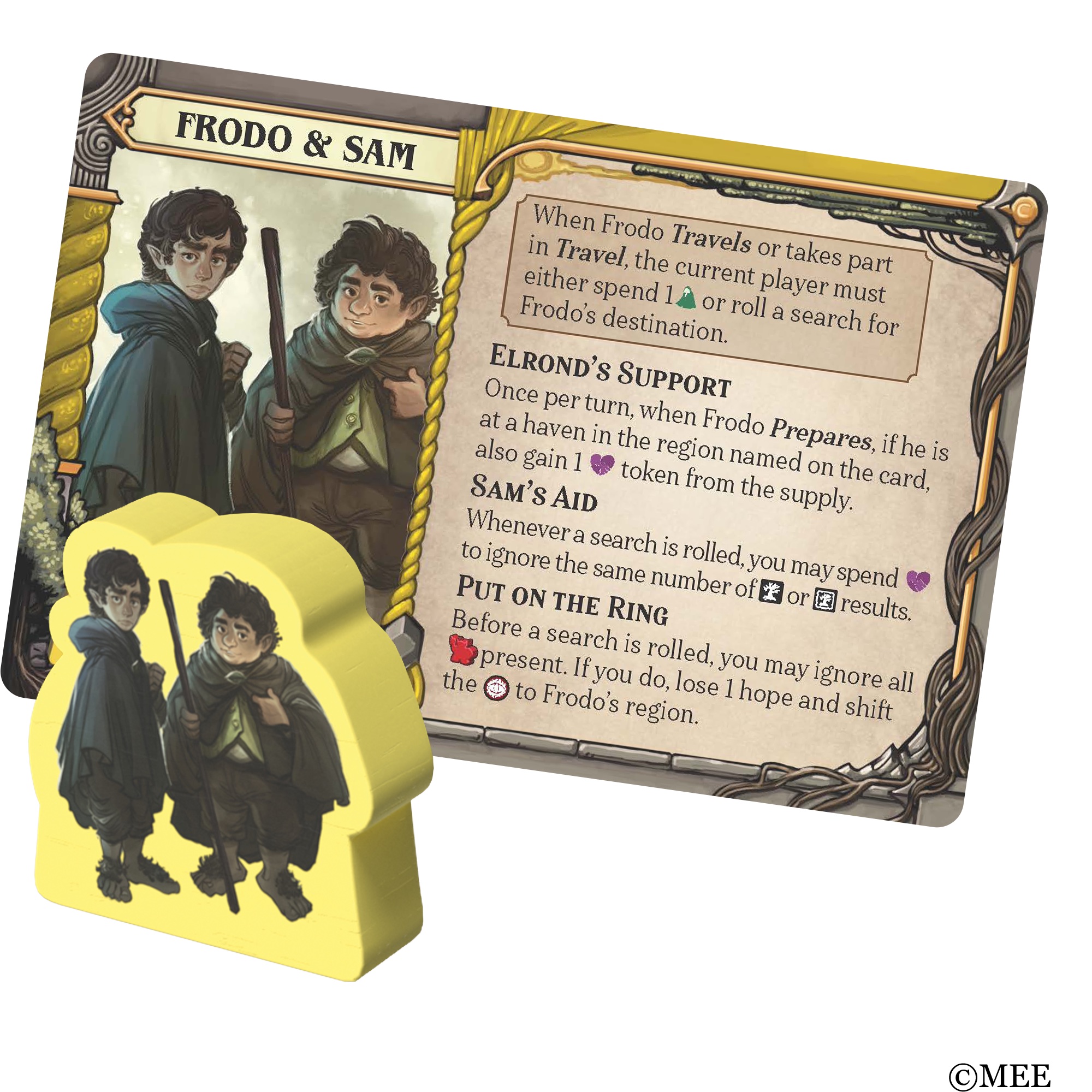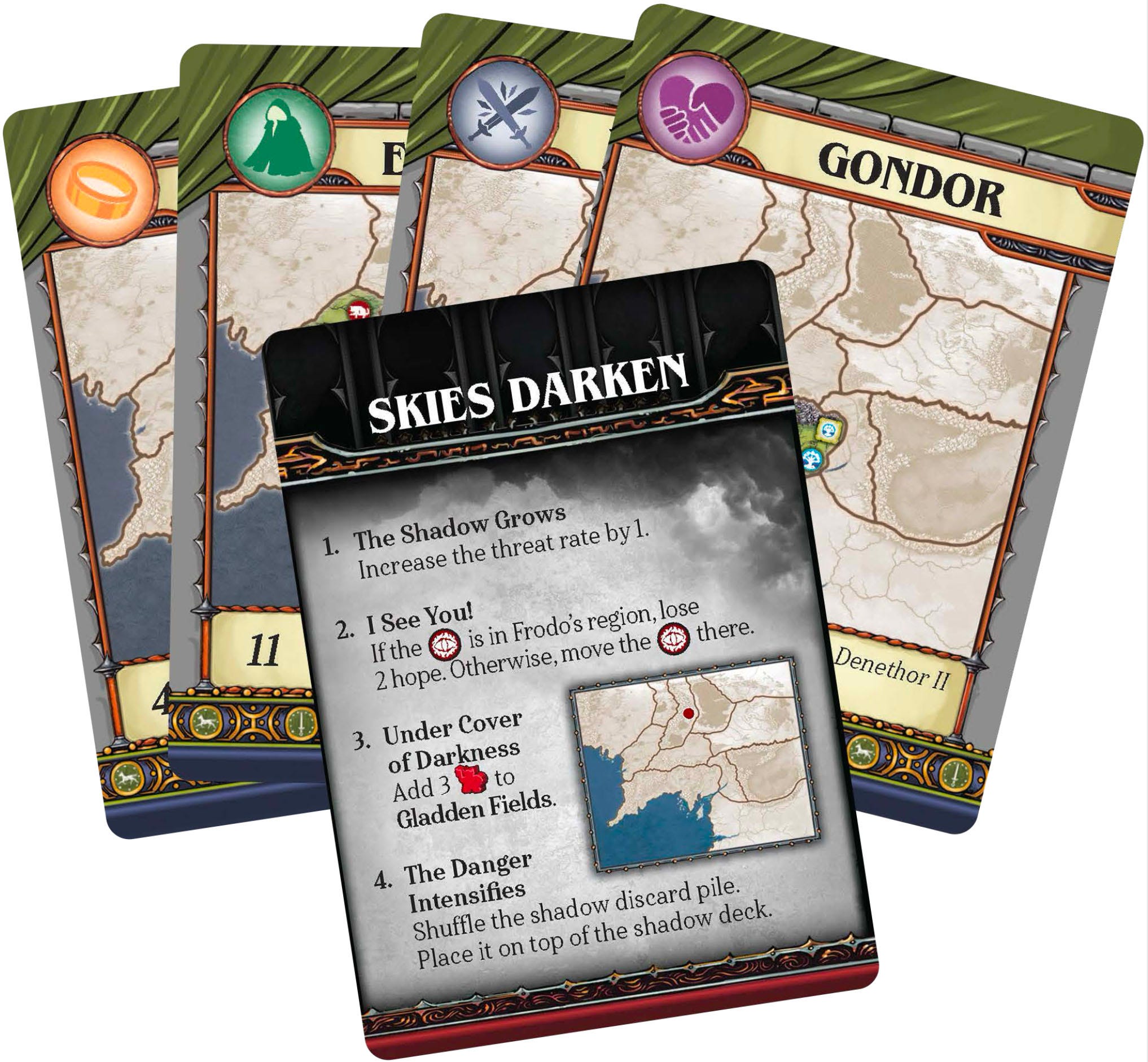 I giocatori devono quindi bilanciare queste risorse e collaborare per completare gli obiettivi, utilizzando un sistema di carte che permette di convertire le risorse in gettoni utilizzabili in seguito. Come accennato in precedenza, infatti, ogni giocatore controlla due personaggi, con un personaggio che esegue quattro azioni in un turno e l’altro personaggio che ne esegue una. Mentre si viaggia attraverso la Terra di Mezzo, i personaggi possono incontrarsi per scambiare carte per aiutarsi reciprocamente a lavorare verso gli obiettivi. Alla fine del proprio turno si pescano altre carte, poi si estraggono le carte ombra per vedere dove si muovono le forze e quali eventi potrebbero verificarsi, con i Nazgûl e l’Occhio di Sauron che sono una minaccia costante.