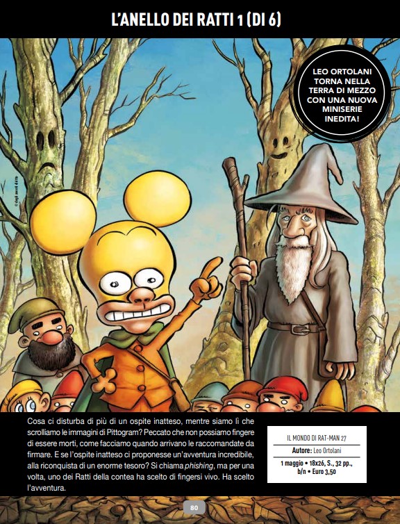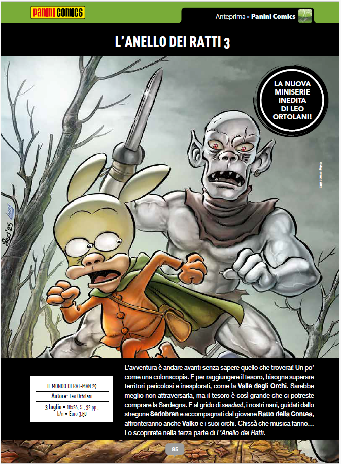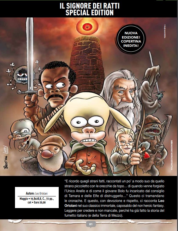 Fra le migliori parodie del Signore degli Anelli sia per riuscita, sia per apprezzamento del pubblico figura senza alcun dubbio Il Signore dei Ratti di Leo Ortolani. A testimonianza di questo successo ci sono le numerose edizioni che Panini ha dedicato a questo fumetto, alle quali si aggiungerà, nel corso del mese di maggio 2025, una nuova Special Edition. Le novità non sono però tutte qui, perché a questa nuova edizione si affiancherà un’avventura inedita: L’Anello dei Ratti, una miniserie in 6 spillati mensili anch’essa pubblicata a partire da maggio.