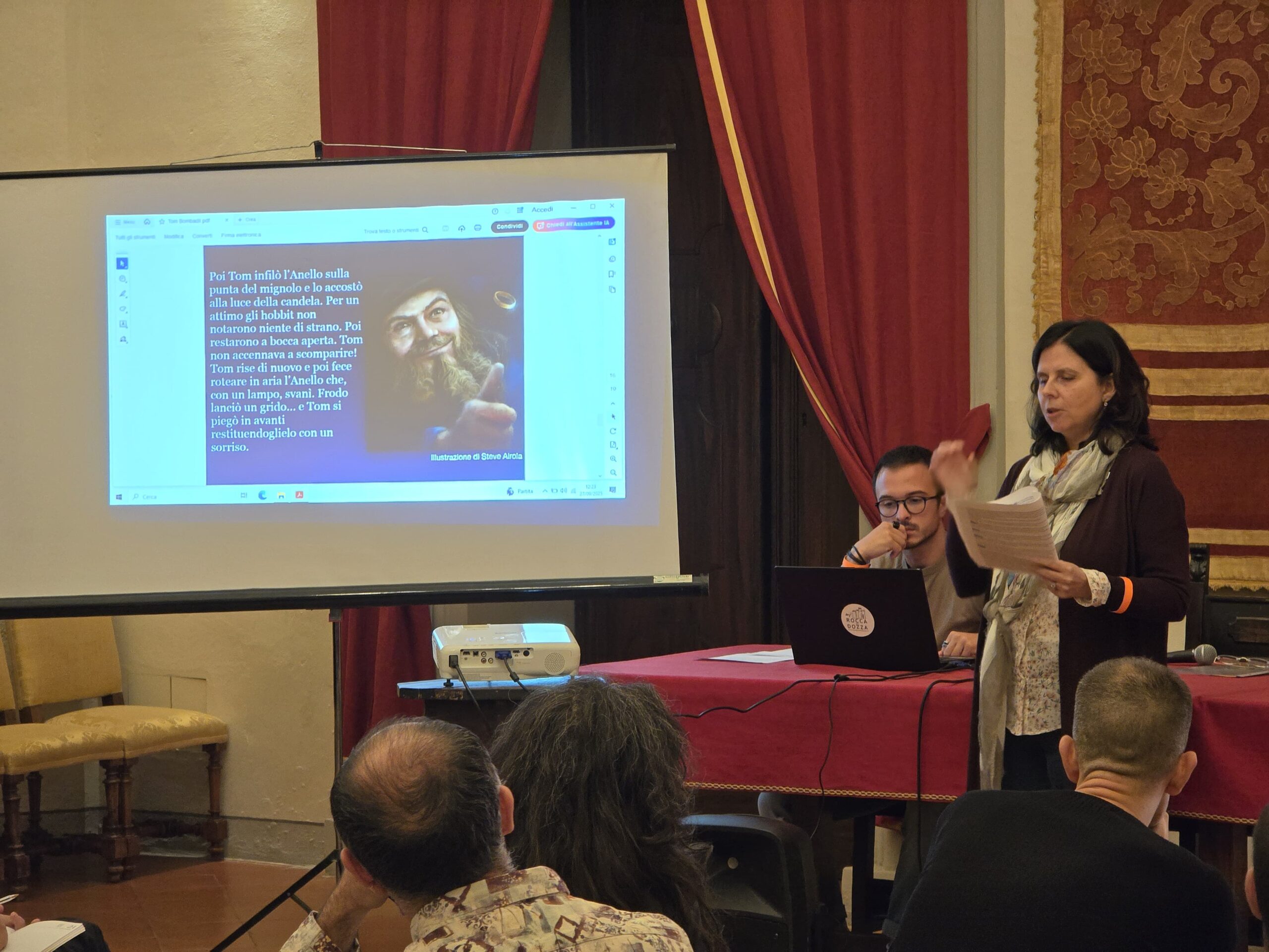 Sabato mattina, dopo i saluti istituzionali, ha aperto le danze il socio fondatore romano Lorenzo Gammarelli, traduttore dell’epistolario tolkieniano, il quale ha ripercorso le tappe della travagliata storia del Signore degli Anelli in Italia, fino ai giorni nostri. A seguire, la giovane socia romagnola Virginia Cavalli, filologa germanica e docente di tedesco, già collaboratrice della rete dei Tolkieniani Italiani, ha parlato del rapporto tra studio accademico e narrativa in Tolkien, ovvero dell’impatto dello studio dell’anglosassone sulla produzione del suo mondo fantastico, e in particolare del rapporto tra il Beowulf e Lo Hobbit.