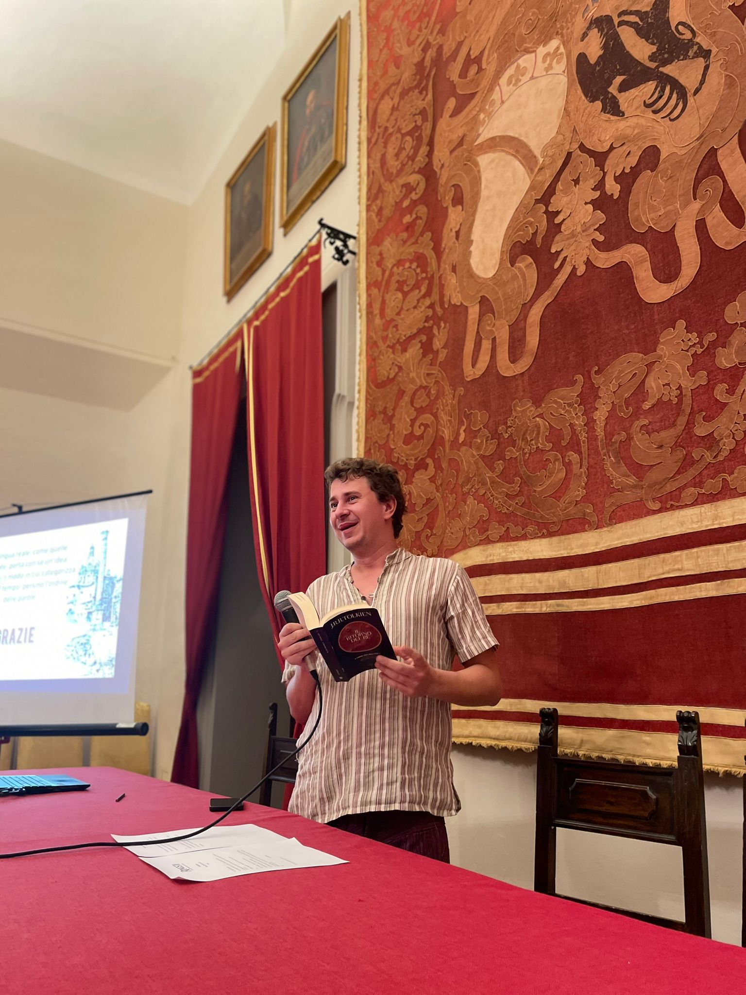 Nel pomeriggio, la neosocia Adele Loia, ricercatrice di Linguistica presso l’università di Bologna, affiancata da Roussel Magdi Sobih, ha presentato una bellissima ricostruzione dell’impianto linguistico sotteso alla subcreazione di Arda. Considerando come unico precedente illustre quello dell’ateneo di Parma, che da anni si occupa di questo tema, si può dire che finalmente a parlare di un aspetto cruciale della mitopoiesi tolkieniana sono stati degli studiosi di linguistica, cosa non scontata nemmeno all’estero, in area anglofona e non, e assolutamente rara in Italia. Meglio tardi che mai, verrebbe da dire. Poi è venuto il momento più carico di pathos, la performance di Riccardo Ricobello, amico dell’AIST, doppiatore e lettore di audiolibri, tra cui Lo Hobbit nella nuova traduzione di Wu Ming 4 (Storitel). Riccardo ha incantato la platea con tre brani dal Ritorno del Re: la carica dei Rohirrim, il risveglio di Sam a Cormallen, e il finale del romanzo, che ha fatto venire gli occhi lucidi a più di una persona presente.