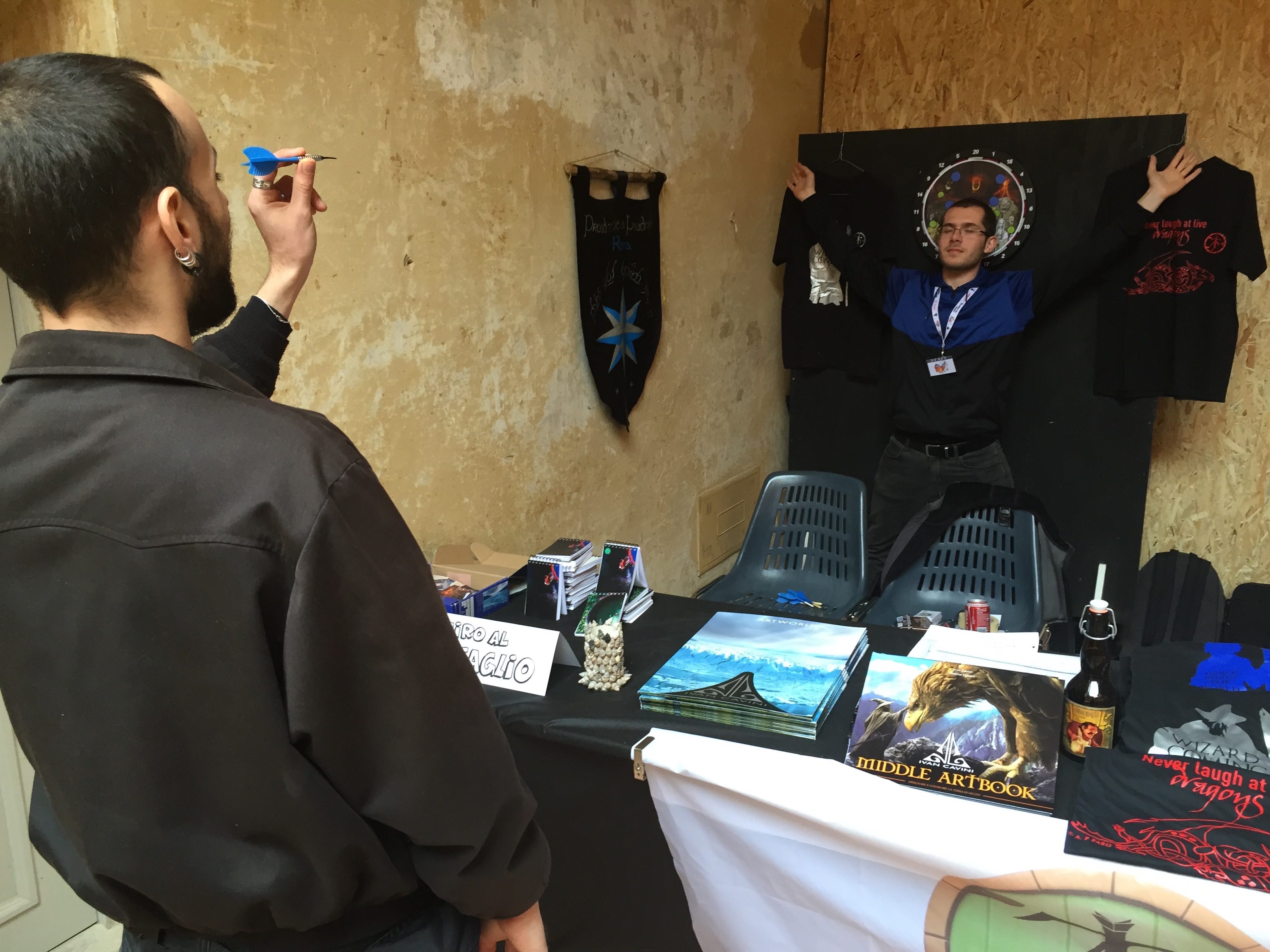 «Libri, libri, libri», chiedeva la gente nella corte centrale. La novità di quest’anno sono stati i tantissimi autografi richiesti ai sorpresi autori, novelli rockstar di Fantastika 2015. Svuotate anche le scatole con le t-shirt realizzate dall’Associazione, fortuna non tutte perché non si attendeva un successo anche delle magliette ricordo. La fortuna invece non ha aiutato nessuno di coloro che si son voluti cimentare nel tiro al bersaglio dello stand, vero e proprio punto d’onore per chi voleva abbattere Sauron! Per tutto questo e per tutto il resto, non si può che esser grati: a Norbert per la depressione post-evento; a Manuele per quella durante l’evento; a Lorenzo per la bontà dei panini crudo e formaggio; a Simona per il disegno del gufo reale; all’altro Lorenzo per aver sostituito il bersaglio durante il tiro di Dario e a quest’ultimo per averlo sbagliato;