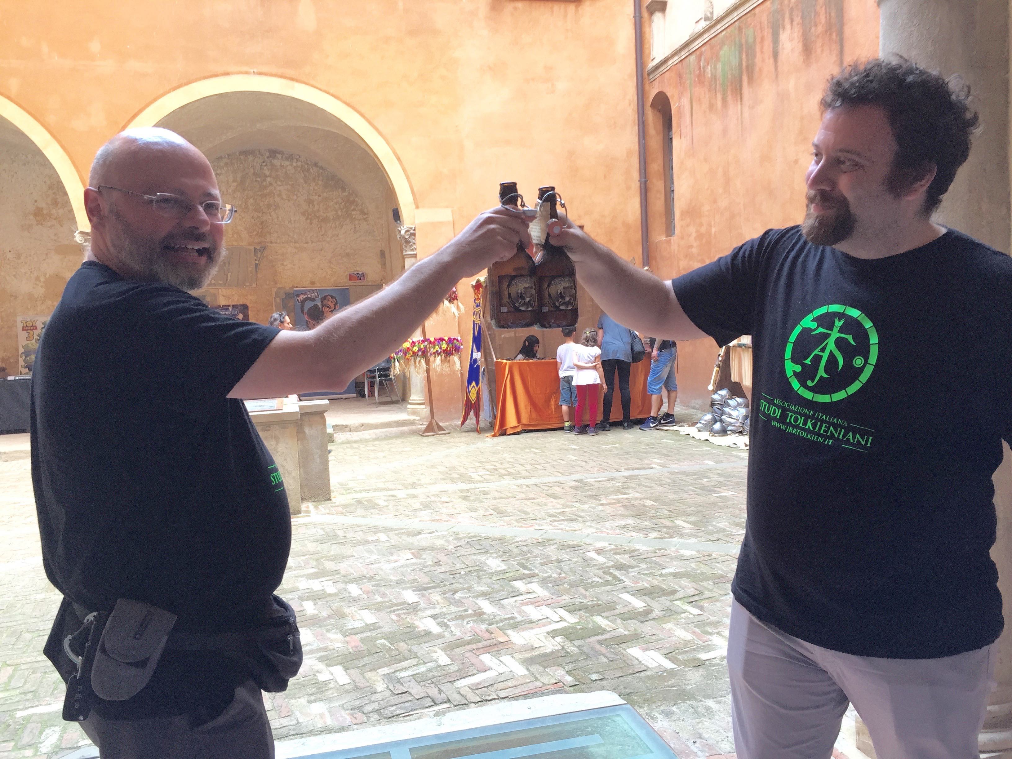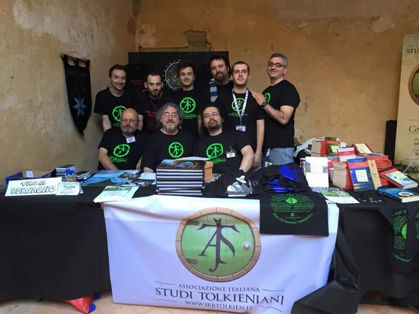 L’incessante pioggia di sabato mattina non ha fermato gli appassionati di J.R.R. Tolkien e il gruppone dei soci dell’AisT, che quasi al completo sono giunti da tutta Italia per far funzionare la “macchina” della manifestazione. Sedie e tavoli son stati spostati, i biglietti son stati strappati, quadri e statue sono state vigilate, oltre alle mille piccole incombenze che son sorte durante i due giorni dell’evento. Ma il cuore pulsante per i soci è stato lo stand, presidiato come non mai, oltre alle altre postazioni strategiche nei torrioni, in pinacoteca, nella sala grande e nelle camere nobiliari. I soci dell’AisT si son contraddistinti per la gentilezza e la professionalità, ce n’erano un po’ ovunque in Rocca con le loro magliette col nuovo logo verde brillante! Lo stand è stato però il centro delle attività anche perché preso letteralmente d’assalto dagli appassionati.