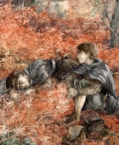 Quando illustro Tolkien cerco di evitare i luoghi comuni che si ripetono spesso nella arte legata alla fantasy, come ad esempio le orecchie a punta per gli Elfi. Ho cercato di mantenere il realismo che l’autore inglese crea nelle sue opere, nonostante il loro contenuto mitologico. Io uso un sacco di riferimenti storici, soprattutto quando si tratta di rendere autentica e realistica una scena disegnando armi, costumi e architettura del periodo appropriato, in particolare quelle provenienti