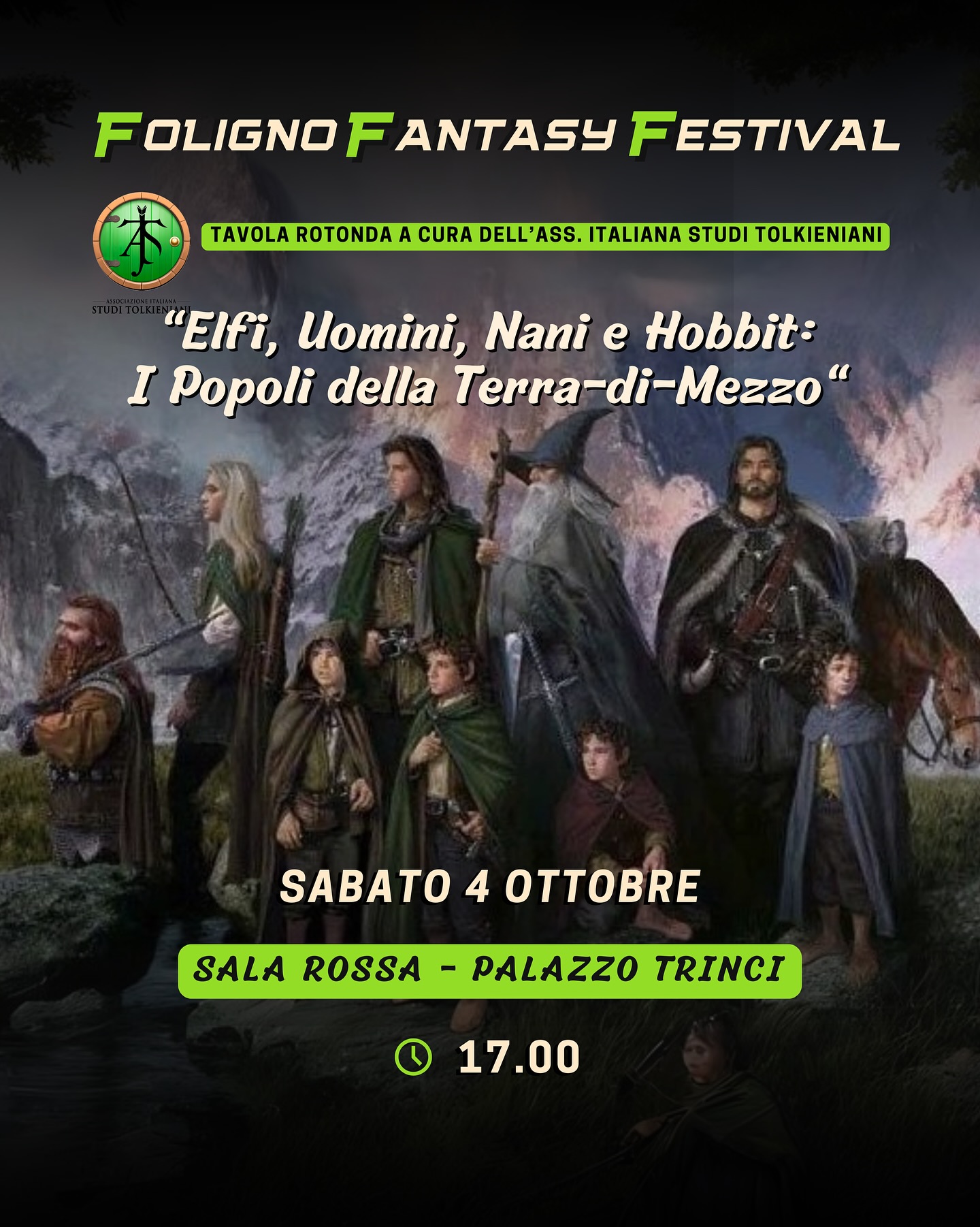 Eventi AISTFoligno Fantasy Festival – 2025 Sabato 4 Ottobre e Domenica 5 Ottobre, la città di Foligno ospiterà la quarta edizione di Foligno Fantasy Festival. “Elfi, Uomini, Nani e Hobbit: I Popoli della Terra-di-Mezzo”Questo sarà il tema della Tavola Rotonda organizzata da AIST (associazione italiana studi tolkieniani) che si svolgerà SABATO 4 OTTOBRE presso la … Continua a leggere Foligno Fantasy Festival