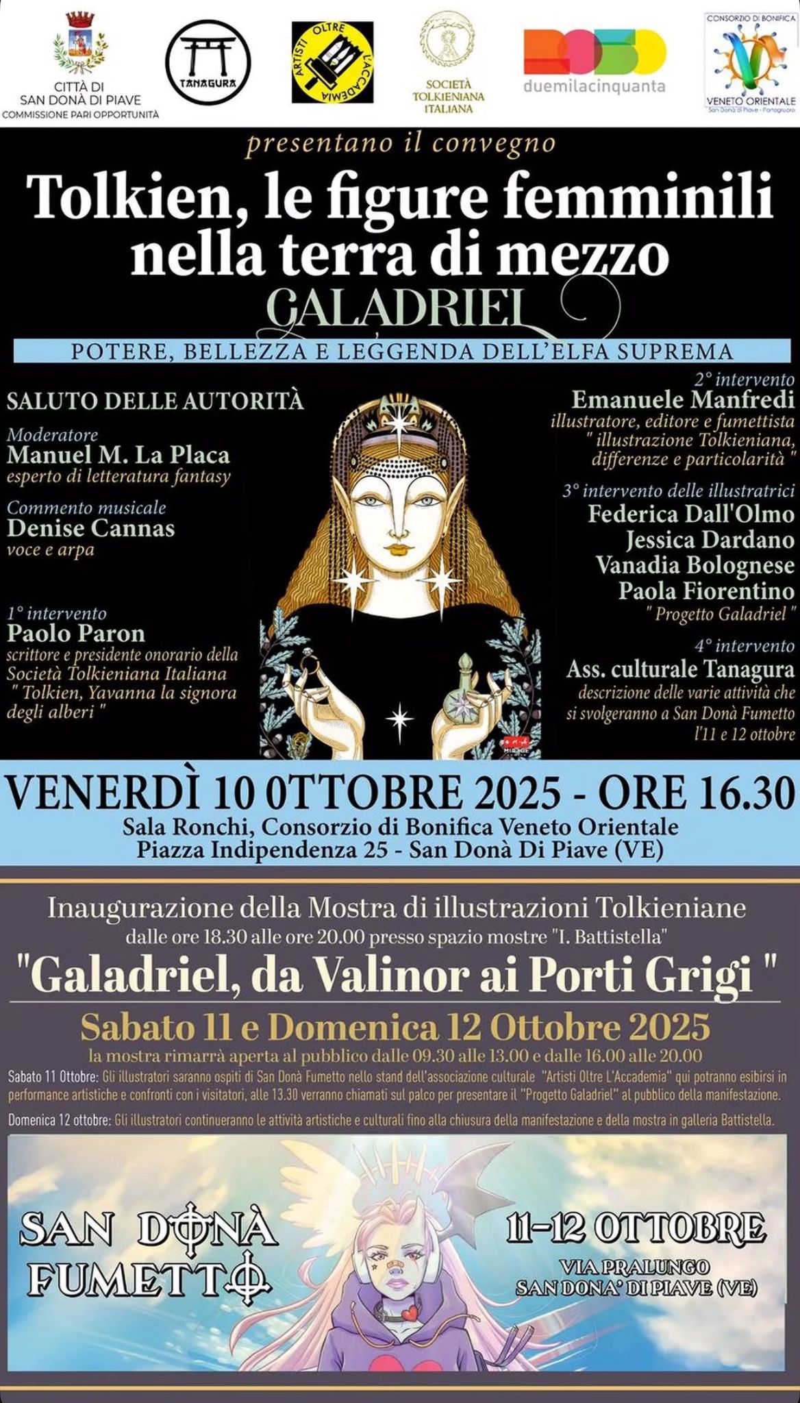 Eventi ItaliaVenerdì 10 ottobre alle ore 16:30 presso la Sala Ronchi, presso il Consorzio di Bonifica Veneto Orientale di San Donà di Piave, si potrà partecipare a un incontro con Paolo Paron, scrittore e saggista nonché nostro presidente onorario, che sarà affiancato da Manuel Massimiliano la Placa, moderatore dell'evento, dalle illustratrici del progetto Galadriel e dal … Continua a leggere Tolkien, le figure femminili nella TdM
