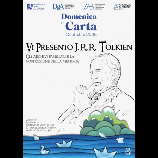Archivio di Stato di Bari Via Oreste Pietro, 45, Bari, Bari, ItalyEventi ItaliaVi presento J.R.R. Tolkien – Gli archivi familiari e la costruzione della memoria In occasione della Domenica di Carta 2025, l’Archivio di Stato di Bari propone alle ore 10 la conferenza “Vi presento J.R.R. Tolkien – Gli archivi familiari e la costruzione della memoria”, dedicata al rapporto tra archivi familiari, memoria e immaginari collettivi, prendendo … Continua a leggere Vi presento J.R.R. Tolkien