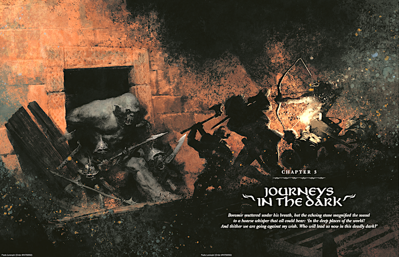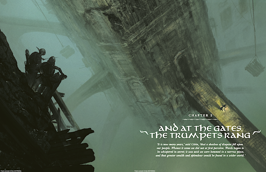 Se si dovesse trovare una cifra poetica per l’opera di Ivan forse potrebbe essere questa: la mescolanza dei due mondi, quello primario e quello secondario. Elementi naturali, architettonici e perfino personaggi del nostro piano di realtà confluiscono, rivisitati, nella Terra di Mezzo. È il caso ad esempio del monumento a Walter Scott di Edimburgo, che diventa la torre di Orthanc; o di certe vette delle Dolomiti che campeggiano sullo sfondo di alcune illustrazioni; o ancora della vaga somiglianza di Beorn con Jason Mamoa. Il messaggio è chiaro: come lo scrittore pratica la contaminatio, riadatta modelli narrativi della tradizione a storie e contesti nuovi (Tolkien era un maestro in questo), così in un certo senso fa l’artista, ricontestualizzando elementi del mondo primario in quello secondario, e dimostrando così plasticamente che l’uno permea l’altro, ma anche che non si dà fantasia senza ragione, che non c’è invenzione che non necessiti di una sua ferrea ratio… e che «noi siamo fatti della stessa sostanza dei sogni», per citare il Bardo d’Inghilterra.