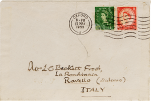 The letter was addressed to Lucille Catherine Beckett, married Frost (1884–1979). She was the second daughter of Lord Grimthorpe, Ernest William Beckett, making her a baroness, and she was also an English philosopher and scientist. Her most notable works include Unbounded Worlds (1959) and Neti Neti (1955), as well as Everyman and the Infinite (1922), The World Breath (1935), Movement and Emptiness (1968), and Insight and Solitude (1973). However, what stands out is the address itself, which lacks precise street or house number information. The letter had to reach its destination without further details because the location was well-known: Villa Rondinaia in Ravello.