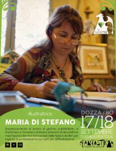 L’esposizione ha unito due progetti dell’artista veneta: il calendario Lords for the Ring 2022 illustrato tramite gli acquerelli e i Tarocchi Perduti e Ritrovati, entrambe pubblicate da Eterea Edizioni. Maria Distefano ha fatto della sua passione per Elfi, fate, folletti, troll e spiritelli un lavoro artistico che migliora ogni anno di più. Conosciuta agli appassionati di Tolkien per le molte mostre, i calendari, le agende e la presenza fissa dei suoi disegni alle manifestazioni tolkieniane, Distefano ha ricevuto premi e riconoscimenti, organizzato mostre personali e collettive in Italia e all’estero. «Accostare i Tarocchi tradizionali di Marsiglia ai personaggi della saga del Signore degli Anelli è stata una sfida interessante, analizzando e studiando i loro simbolismi ho cercato di associare a ogni lama, il personaggio al significato della carta. Il risultato di queste analogie mi ha molte volte sorpreso».