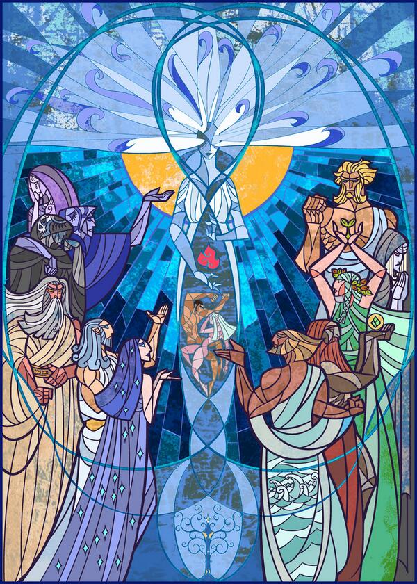 “There was Eru, the One, who in Arda is called Ilúvatar; and he made first the Ainur, the Holy Ones, that were the offspring of his thought, and they were with him before aught else was made. And he spoke to them, propounding to them themes of music; and they sang before him, and he was glad.”