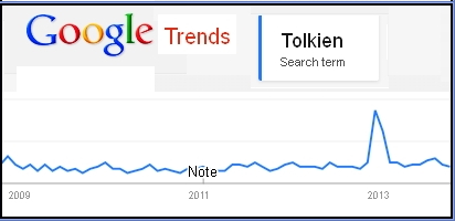 C’erano una volta, all’incirca intorno all’anno 2000, molti sondaggi che dichiaravano in maniera consistente che J.R.R. Tolkien era «l’autore più influente del secolo» e che Il Signore degli Anelli era «il libro del secolo». J.R.R. Tolkien venne riconosciuto per Il Signore degli Anelli e Lo Hobbit e molti reporter eccitati saltavano sul carro del vincitore e scrivevano tutti qualcosa sullo scrittore inglese. Ciò che tutti di sicuro sapevamo era che c’era un’eccitazione generale, poiché avevamo imparato che un regista di nome Peter Jackson stava per fare l’impossibile, far diventare i libri di Tolkien dei film al cinema. Ora, molti anni dopo, possiamo vedere ancora il risultato di tale improvviso interesse, ma in qualche modo possiamo renderci conto che la tendenza è ora più flebile di quanto non fosse. Tuttavia è difficile da misurare, così abbiamo pensato fosse utile riportare l’analisi di Pieter Collier con i seguenti grafici di Google Trends. Mentre Il Ritorno del Re di Peter Jackson uscì nelle sale il 17 dicembre 2003, secondo Google Trends l’interesse per Il Signore degli Anelli era ancora estremamente alto all’inizio del 2004. Sfortunatamente non abbiamo dati del periodo precedente e contemporaneo all’uscita dei film del Signore degli Anelli, ma è chiaro che l’interesse deve essere stato impressionante e più alto allora di adesso con i film sullo Hobbit.