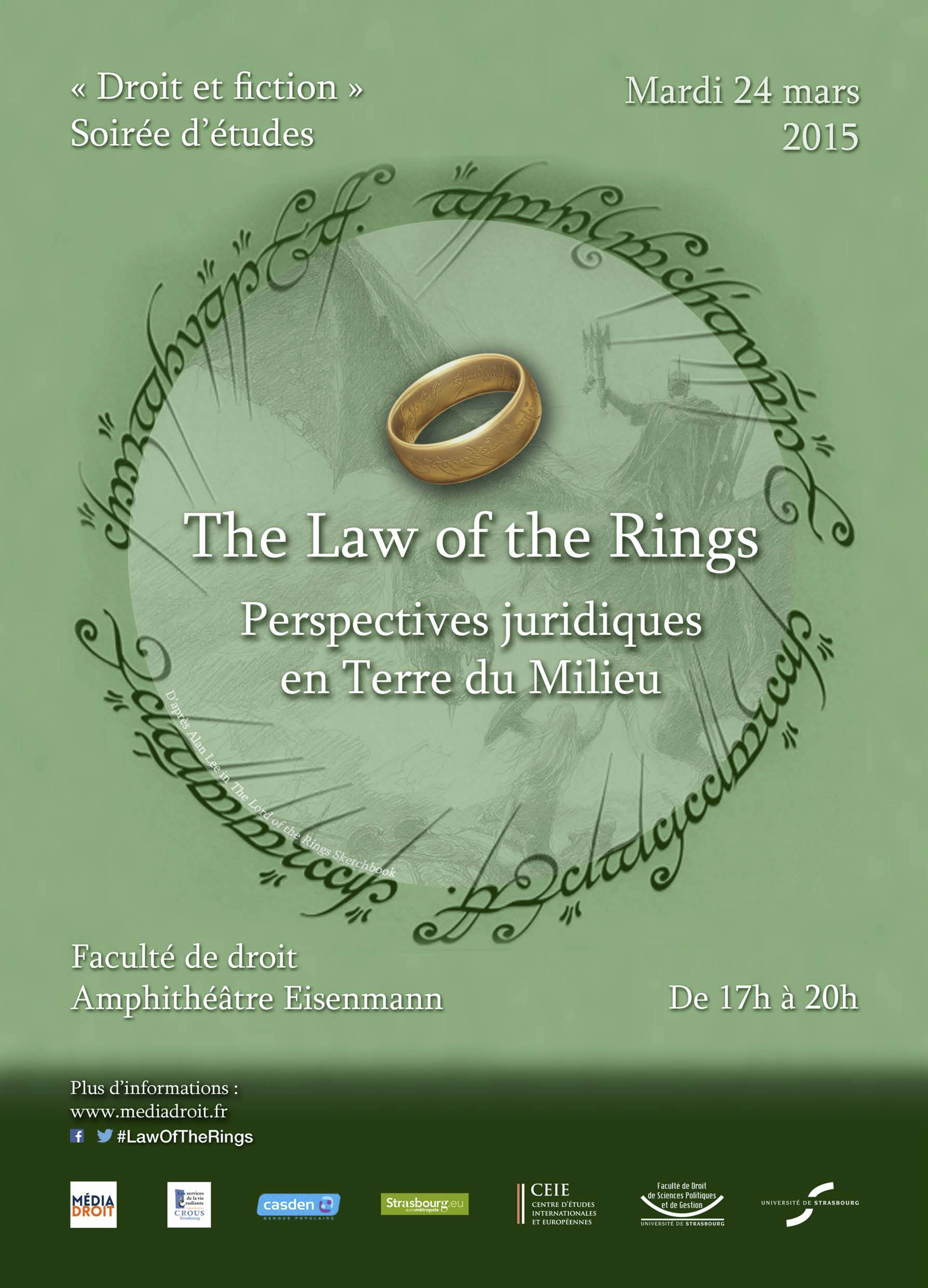 Un gruppo di docenti dell’Università di Strasburgo e l’associazione studentesca Médiadroit hanno organizzato una serata di studio dedicata al diritto nel Signore degli Anelli di J.R.R. Tolkien martedì 24 marzo 2015 presso la Facoltà di Giurisprudenza dalle ore 17 alle 20. Il convegno La legge degli Anelli – Prospettive legali nella Terra di Mezzo mira a fornire ai ricercatori una ricerca originale e allo stesso tempo agli studenti presenti un approccio ludico alla giurisprudenza, per facilitare l’accesso a questa disciplina ritenuta difficile.